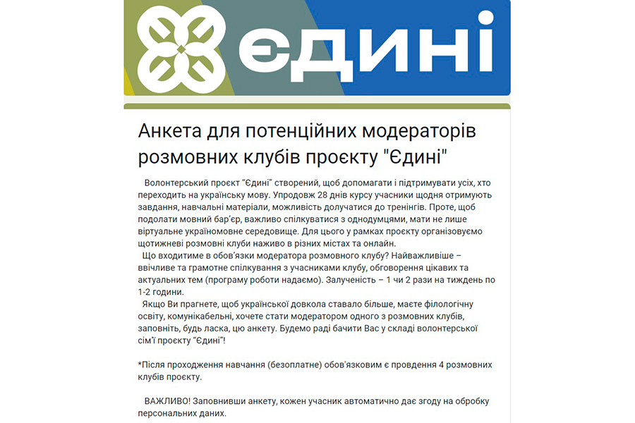 Також шукаємо модераторів розмовних клубів у Чернігові, Одесі, Києві, Львові.