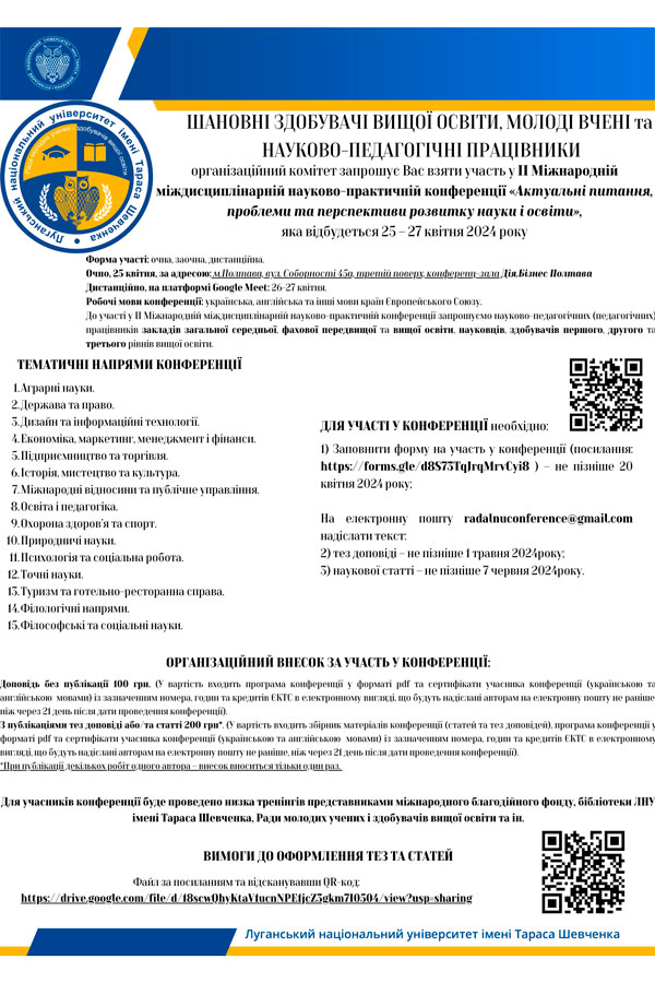 We invite graduates of the first, second and third levels of higher education, scientific-pedagogical (pedagogical) employees of general secondary, professional pre-higher and higher education institutions, scientists to participate in the 2nd International Interdisciplinary Scientific and Practical Conference.