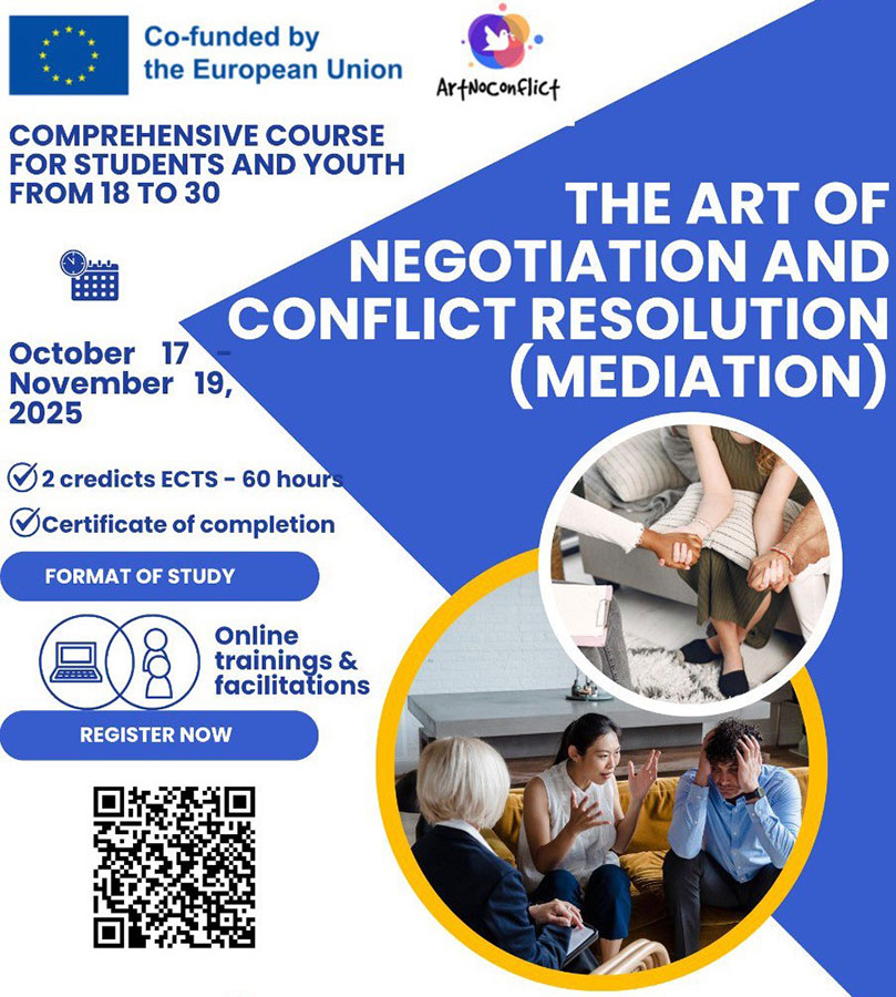 As part of the Erasmus + virtual mobility project "The art of negotiation and conflict resolution (mediation) / ArtNoConflict", we invite young people from your educational institutions to the online certified course "The art of negotiation and conflict resolution (MEDIATION)".