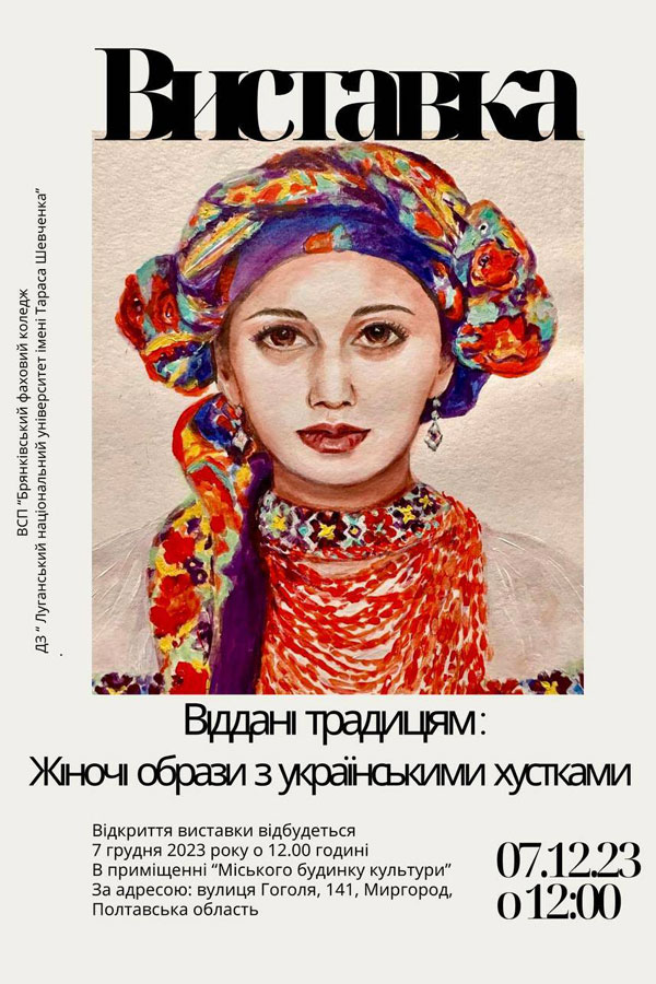 Women's images with Ukrainian headscarves Brianka Professional College of LTSNU will be held on December 7, 2023 at 12:00 in the premises of the "City House of Culture" at the address: 141 Gogol St., Myrhorod, Poltava Region.