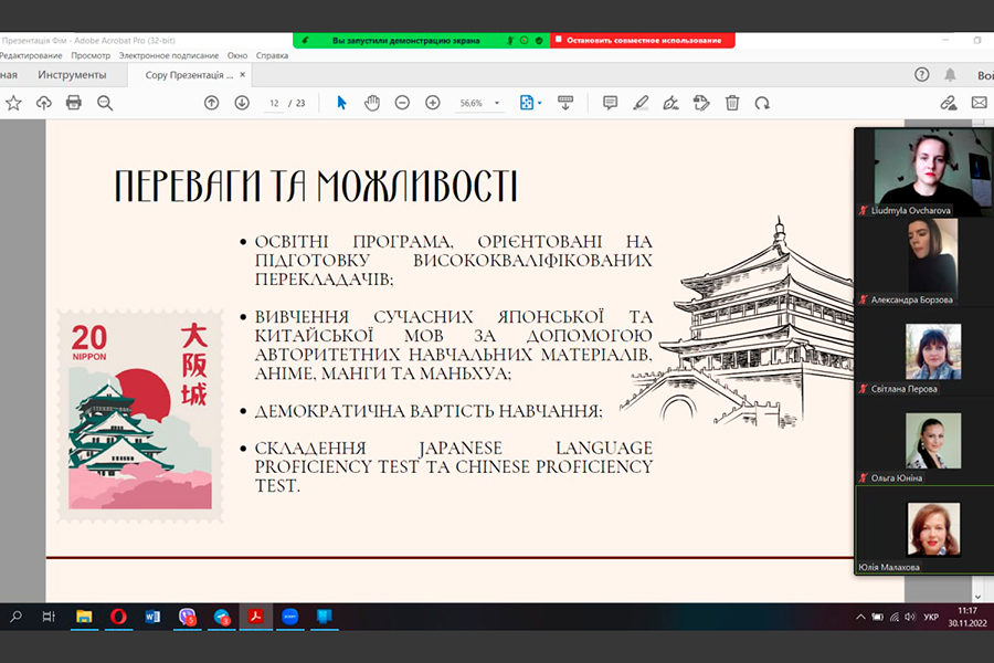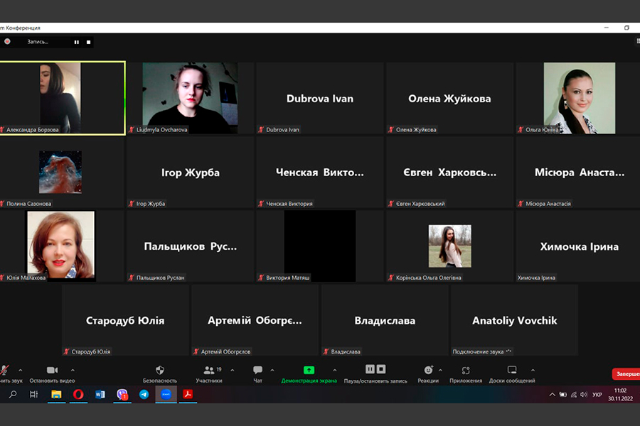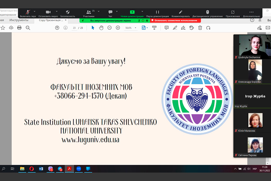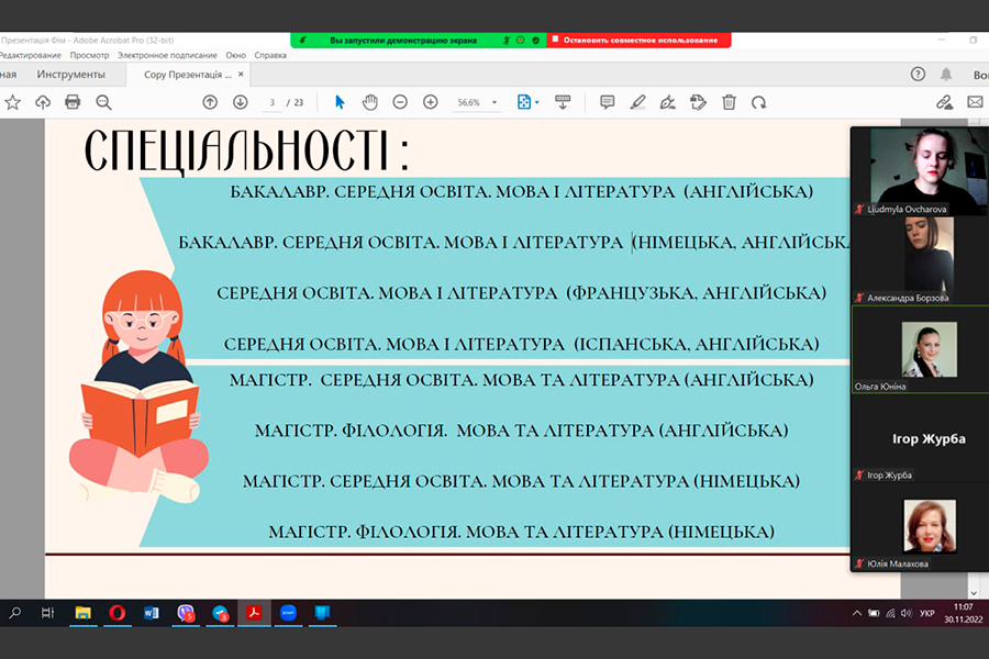 The event was organized and held in two formats - online (for schoolchildren of Poltava, Poltava and Donetsk regions) on the Zoom platform, and offline - with the physical presence of faculty representatives in the city of Lubny, Poltava region, where the university administration currently works. Acting Dean of the faculty Iryna Myhovych, Vice Dean in charge of Educative Affairs Liudmyla Ovcharova, heads of departments and lecturers of the faculty attended the online meeting. The pupils represented the following institutions: Poltava School No. 11, Poltava Gymnasium No. 13, Poltava School No. 22, Poltava School No. 24, Poltava Gymnasium No. 33, Novosanzhar Lyceum, Kramatorsk Secondary School No. 22 with specialized training named after Mykola Mykolayovych Krupchenko of Kramatorsk City Council of Donetsk Region, Kremenchuck Gymnasium No. 2, Kremenchuck Lyceum No. 10 "Linguist", Kremenchuck Gymnasium No. 22, Kremenchuck Lyceum No. 5 named after T.G. Shevchenko. During the presentation of the educational offer of the Faculty of Foreign Languages in 2023, participants were asked to fill out an online registration form. In total, more than forty people attended the event.
