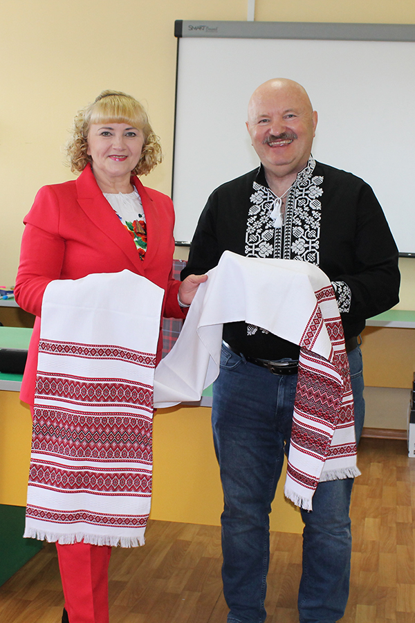 Vitalii Zeliuk, director of the Poltava Academy of Continuing Education named after M.V. Ostrogradskyi, with whom the head of Luhansk Taras Shevchenko National University exchanged gifts. Ms. Olena presented a "rushnik" - Ukrainian embroidered towel, and Ms. Vitalii presented a unique, two-volume Poltava edition of Ivan Kotlyarevsky's Aeneid, the founder of new Ukrainian literature.