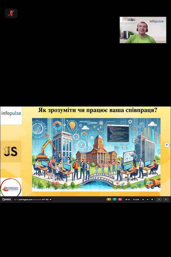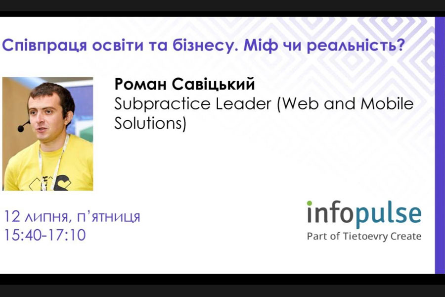 The speaker was Roman Savytskyi, Subpractice Leader (Web and Mobile Solutions). Mr. Roman shared his experience of involving business representatives in the educational process not only in Ukraine, but also abroad. He provided thorough theses for discussion and outlined the main ways of cooperation.
