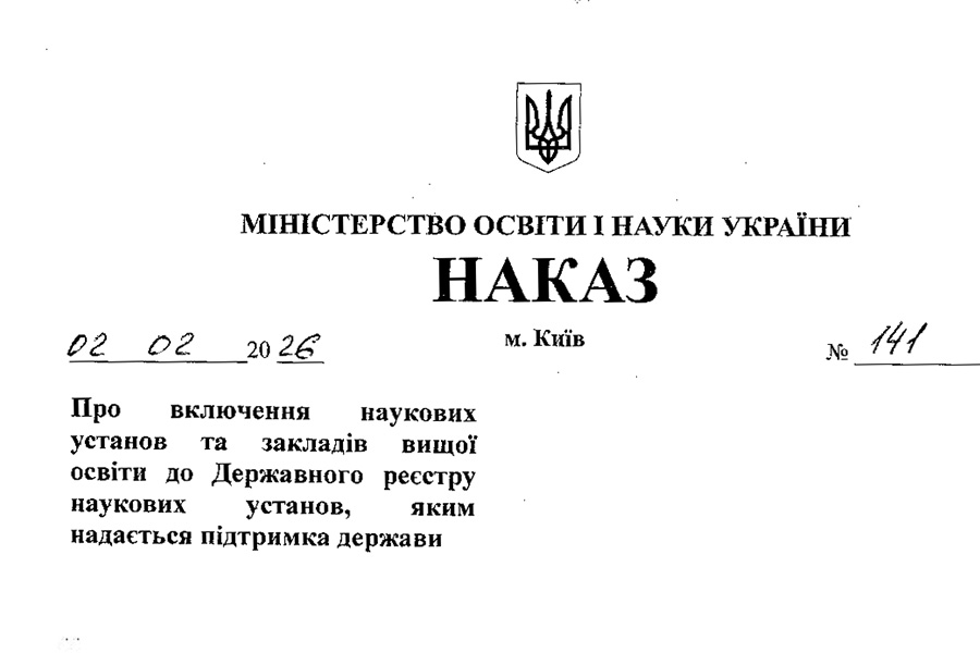 In accordance with the order of the Ministry of Education and Science of Ukraine dated 02.02.2026, the university was included in the State Register of Scientific Institutions Provided with Financial Support by the State.