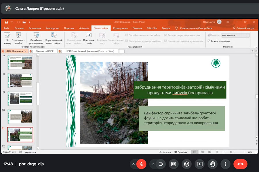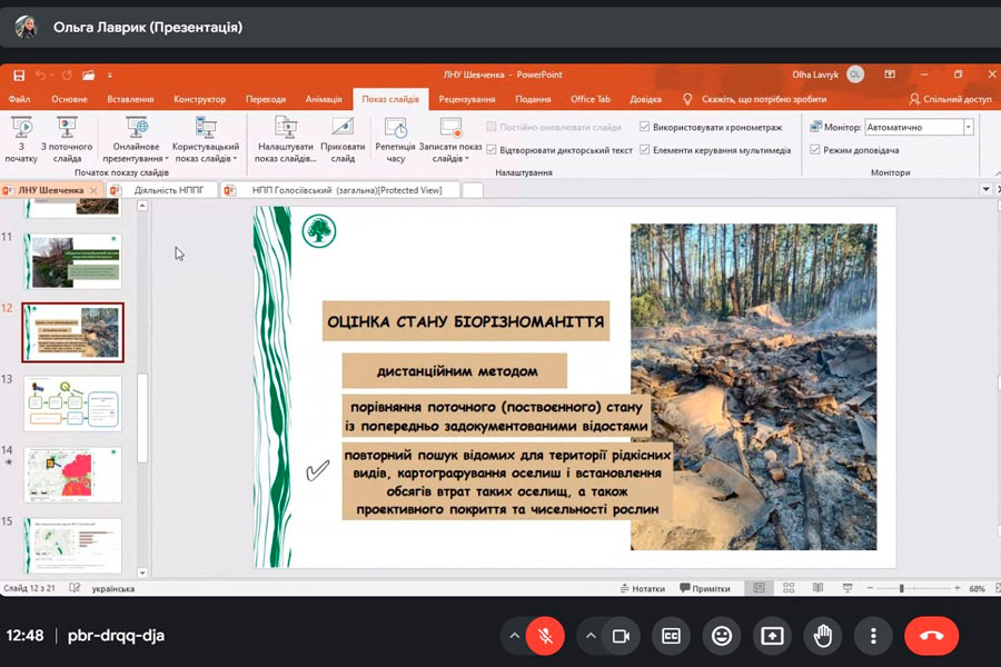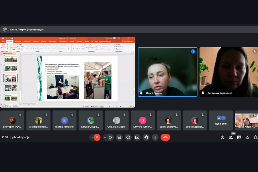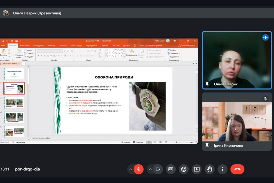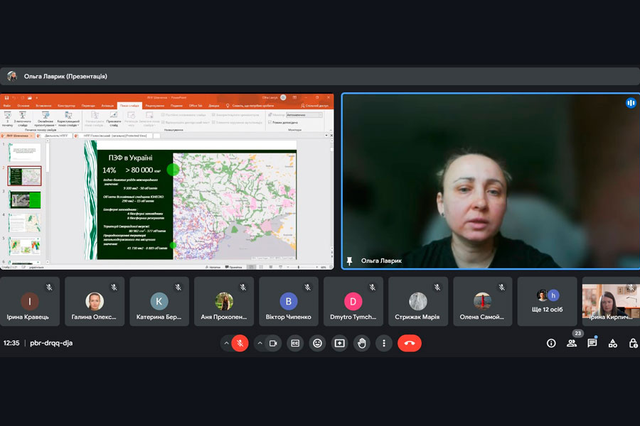 Mrs. Olha talked about what methods are used to study the state of the environment and what environmental damage is caused to nature. Therefore, during the meeting, important issues were considered - what should be the next steps for nature conservation in Ukraine: inventory and mapping of populations of all species that can be identified (as well as types of habitats); determining the impact of military factors on species; determination of indicators of unacceptable levels of pollution due to military actions for biodiversity and development of methods for their determination; identification of indicator species and development of monitoring programs for them; counts of the number of all rare species; mapping invasive species and monitoring their spread; monitoring of successional changes, determination of the volume of ecosystem services not received by Ukrainian citizens as a result of military digression.