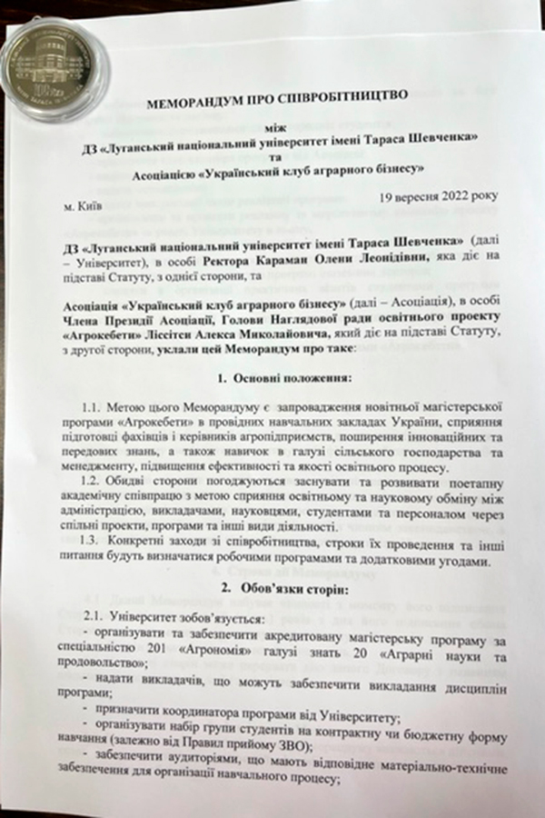 The subject of the Memorandum was the introduction of the newest master's program "Agrokebety" at Luhansk Taras Shevchenko National University by updating the existing educational program "Agronomy", promoting the training of specialists and managers of agricultural enterprises, spreading innovative and advanced knowledge, as well as skills in the field of agriculture and management, improving efficiency and the quality of the educational process.