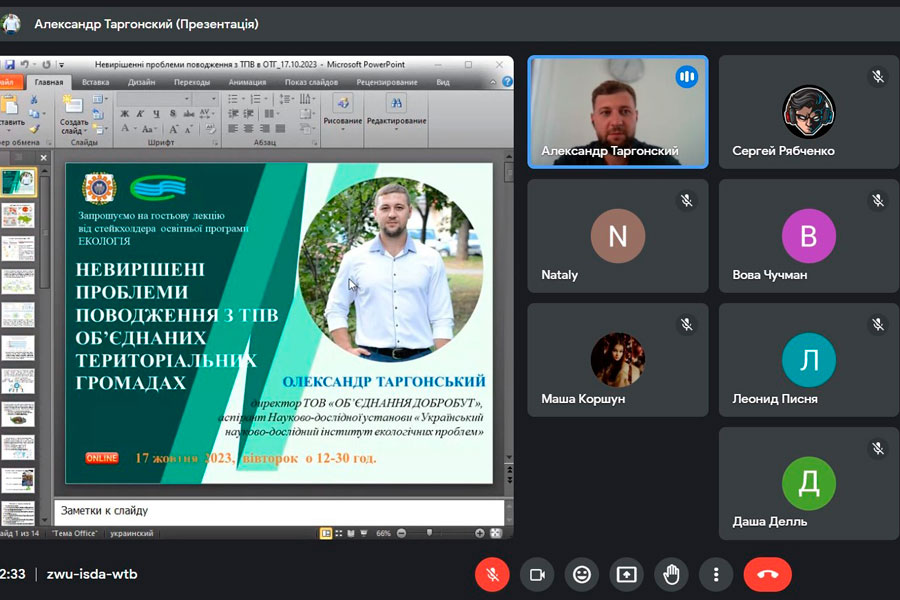 Students and teachers of the Faculty of Natural Sciences attended a guest lecture by Oleksandr Targonskyi, director of Dobrobut Association LLC, postgraduate student of the Ukrainian Research Institute of Environmental Problems. This was the third lecture from the cycle of planned guest lectures from the stakeholder of the Ecology educational program - the Scientific Research Institution "Ukrainian Scientific Research Institute of Environmental Problems" (UKRNDIEP). The moderator of the meeting was Iryna KYRPYCHOVA, guarantor of the Master's level Ecology educational program, Associate Professor of the Department of Landscape Gardening and Ecology.