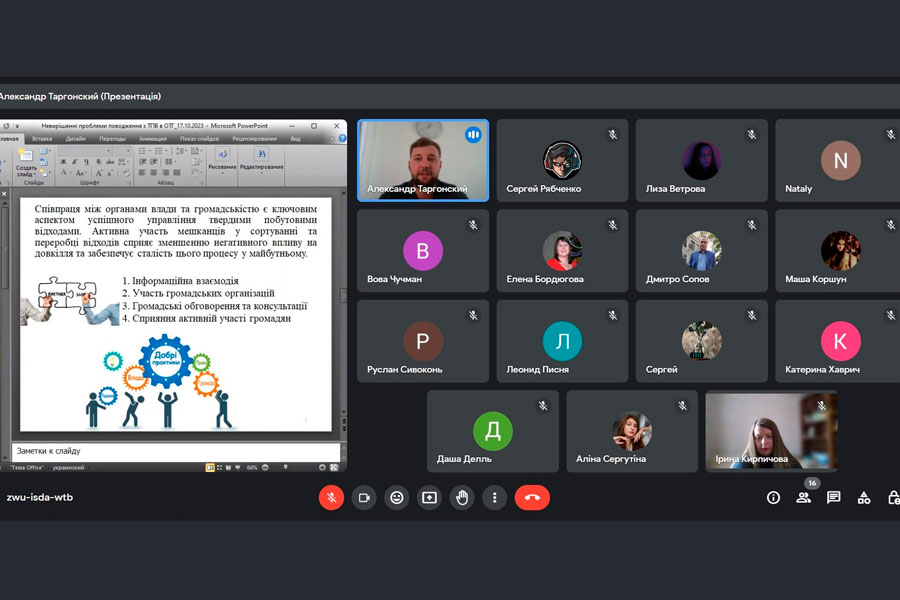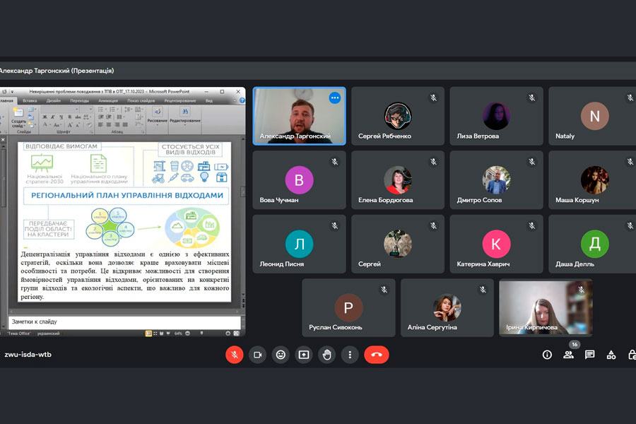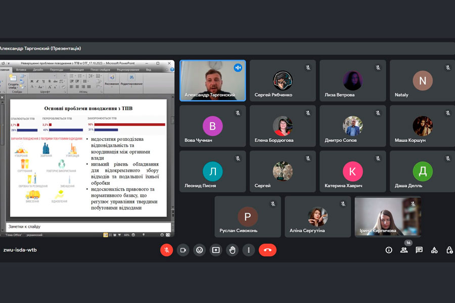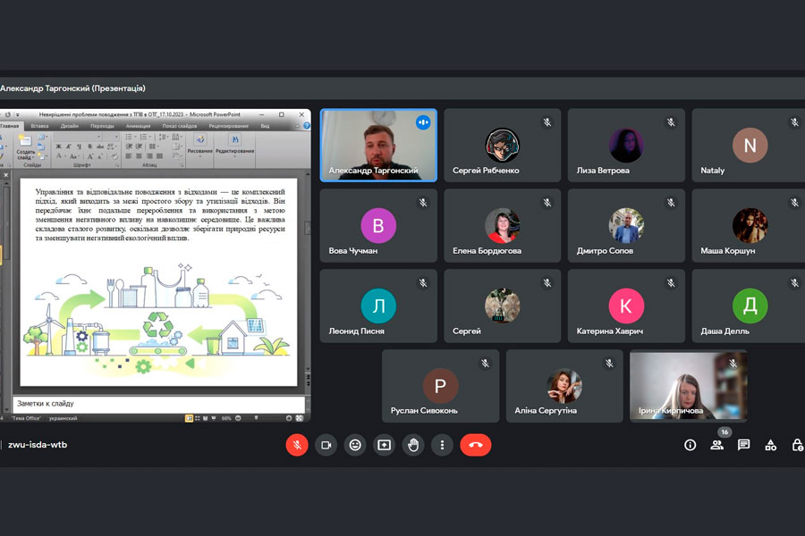 The online lecture took place on October 17 and was devoted to the urgent topic: "Unsolved problems of solid waste management in united territorial communities." During the lecture, important issues related to the main problems of waste management were discussed: insufficient distributed responsibility and coordination between authorities; low level of equipment for separate waste collection and further processing; the imperfection of the legal and regulatory framework governing the management of solid household waste. Waste management and responsible management is a comprehensive approach that goes beyond the simple collection and disposal of waste. It provides for their further processing and use in order to reduce the negative impact on the environment. This is an important component of sustainable development, as it allows preserving natural resources and reducing negative environmental impact.