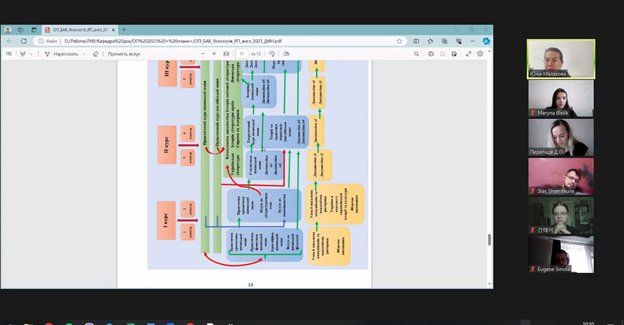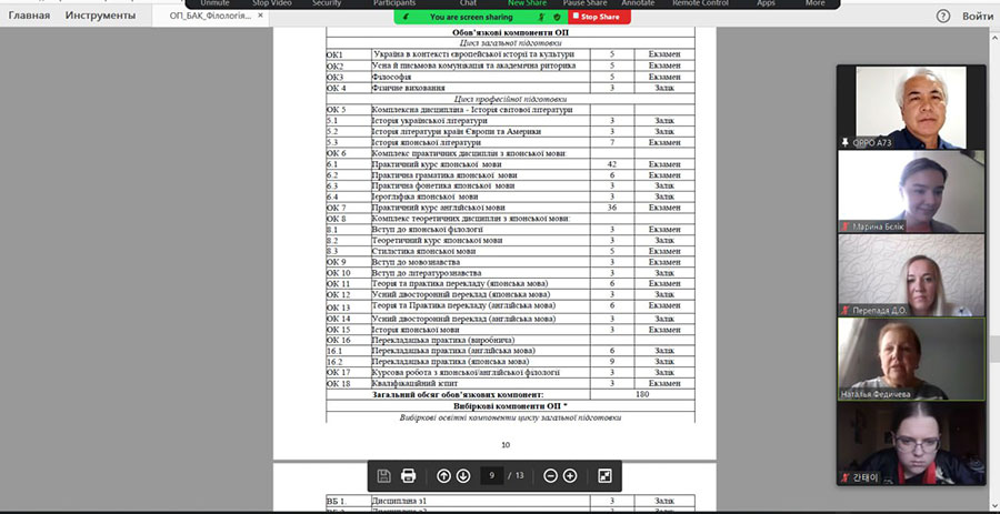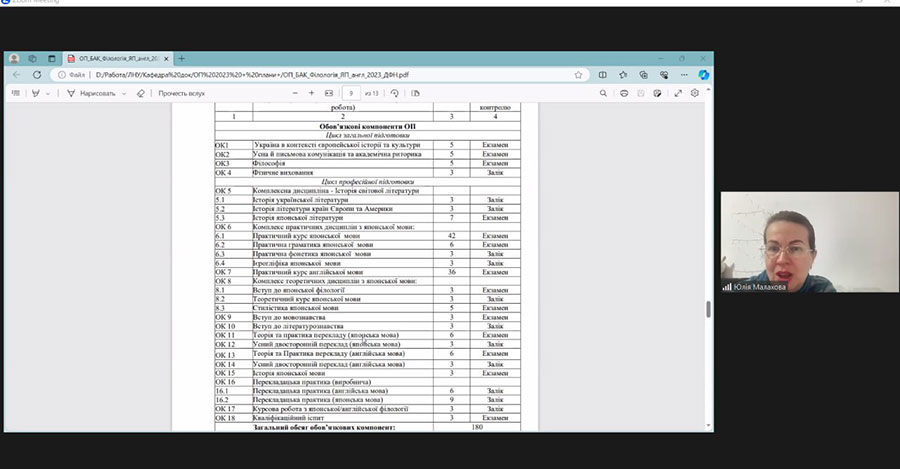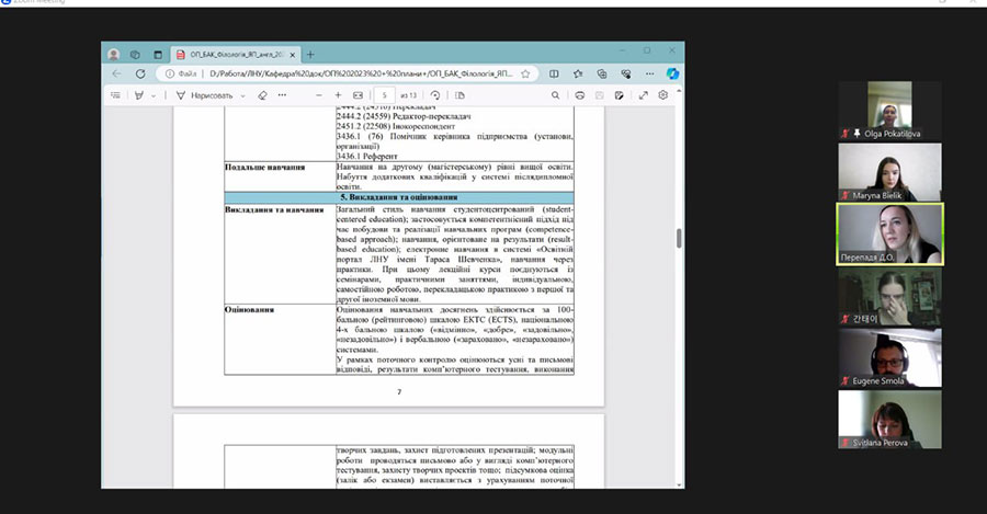 The meeting was also attended by Y. Smola (MSK-NOVA company), S. Shamshura (OSGA IT company) and O. Pokatilova (Deluxe-Voyage travel agency), who take an active part in the process of improving and implementing educational programs. All of them expressed their positive impression of the content and relevance of the presented changes in their reviews. At previous meetings with the guarantors and the workgroup, Mr. Takashi Itozawa, the first teacher of the Japanese language at Luhansk Taras Shevchenko National University, who is systematically invited by the department to events and classes to improve Japanese speaking skills, also shared his opinion about EP "Language and Literature (Japanese, English)".