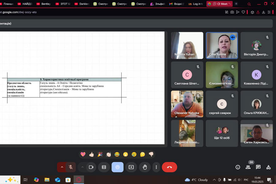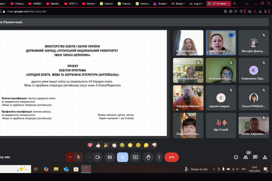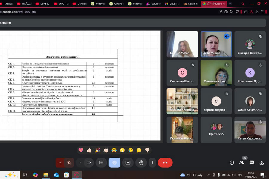 Specialists from other departments of the Institute of Philology and Journalism (Departments of Literary Studies, Oriental Philology and Translation, and Foreign Languages for Professional Purposes), working groups of the educational programs, reviewers, and external stakeholders gathered to improve the quality of training for philology master’s and bachelor’s students. Among the reviewers of the «Secondary Education» programs were: Svitlana Sytnyakivska, Doctor of Pedagogical Sciences, Professor, Professor at the Department of Foreign Languages of Polissia National University; Yelyzaveta Isakova, Candidate of Philological Sciences, Associate Professor, Head of the Department of Philology and Translation at Kyiv National University of Technologies and Design; Oleksandr Naboka, Doctor of Historical Sciences, Professor, Head of the Department of History and Archaeology at Luhansk Taras Shevchenko National University (Class of 2023); Serhii Sevruk, Candidate of Historical Sciences, Associate Professor, Chairman of the Public Council under the Regional State Administration of Luhansk Region, Head of the Luhansk Regional Organization of the Trade Union of Education and Science Workers of Ukraine; Vsevolod Danylchuk, Class of 2024 graduate, English teacher at the Municipal Institution of General Secondary Education «Lyceum No. 13 of the Khmelnytskyi City Council»; Svitlana Zlobynets, Higher Category English Teacher at Novosanzhary Lyceum of the Novosanzhary District Council of Poltava Region; Ihor Protsenko, Candidate of Pedagogical Sciences, Associate Professor at the Department of Applied Philology, Head of the Certification Program "Spanish Studies and Translation" at Mariupol State University; Inna Navarenko, Candidate of Philological Sciences, Associate Professor at the Department of Spanish and Modern Greek Philology at Kyiv National Linguistic University; Liudmyla Kuzhyk, Spanish language teacher at the Private Institution of General Secondary Education "IT Step School" in Poltava, Poltava Region, and others.
