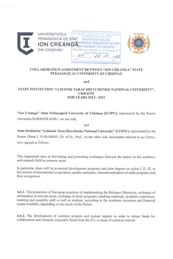 On December 2, 2022, an official online meeting was held at the Faculty of Foreign Languages with representatives of the Faculty of Foreign Languages and Literatures (Facultatea de Limbi şi Literaturi Străine) of the State Ion Creang Pedagogical University (Universitatea Pedagogică de Stat "ION CREANGĂ" din Chișinău), which is a leading state an institution of higher education of the pedagogical direction of the Republic of Moldova, located in the city of Chisinau. The framework agreement on cooperation was signed by the two universities on November 22, 2022 with the active support of the international relations departments of the institutions.