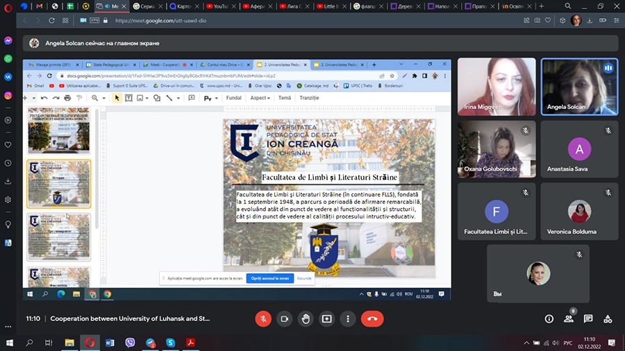 During the meeting, the main achievements and achievements of the partners were presented, as well as the prospects for further cooperation were outlined. In particular, it is noted that the Faculty of Foreign Languages and Literatures (Facultatea de Limbi şi Literaturi Străine) was founded in 1948 and currently has a modern infrastructure with several specialized centers according to the interests of students and teachers: DAAD (German Academic Exchange Service), OeAD (Austrian Agency for International Cooperation in Education and Scientific Research), ETRC (Teacher Resource Center of English), CICF (French-speaking Information and Research Center), CCI (Italian Cultural Center). Taking into account the significant experience of supporting the activities of informational, cultural and resource centers at the Luhansk Taras Shevchenko National University of Ukraine, as well as the prospect of opening the Center of French Language and Culture on the basis of the Faculty of Foreign Languages with the support of the French Embassy in Ukraine in 2023, the parties have worked out a number of the most relevant and promising models of mutually beneficial cooperation, including, in addition to the above, student mobility, guest lectures, a double degree program for master's degree programs, development of joint grant projects, and Ukrainian studies on certain aspects of culture and language.
