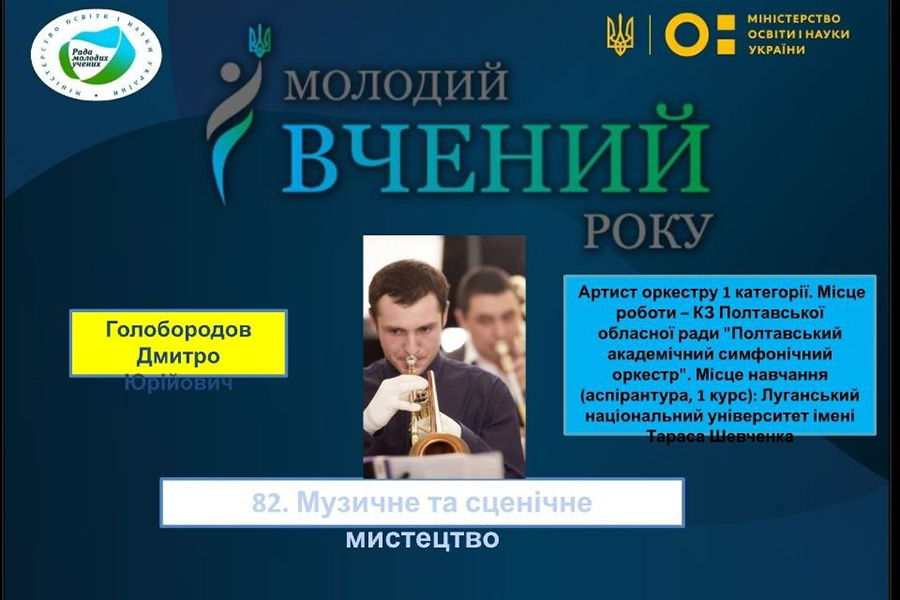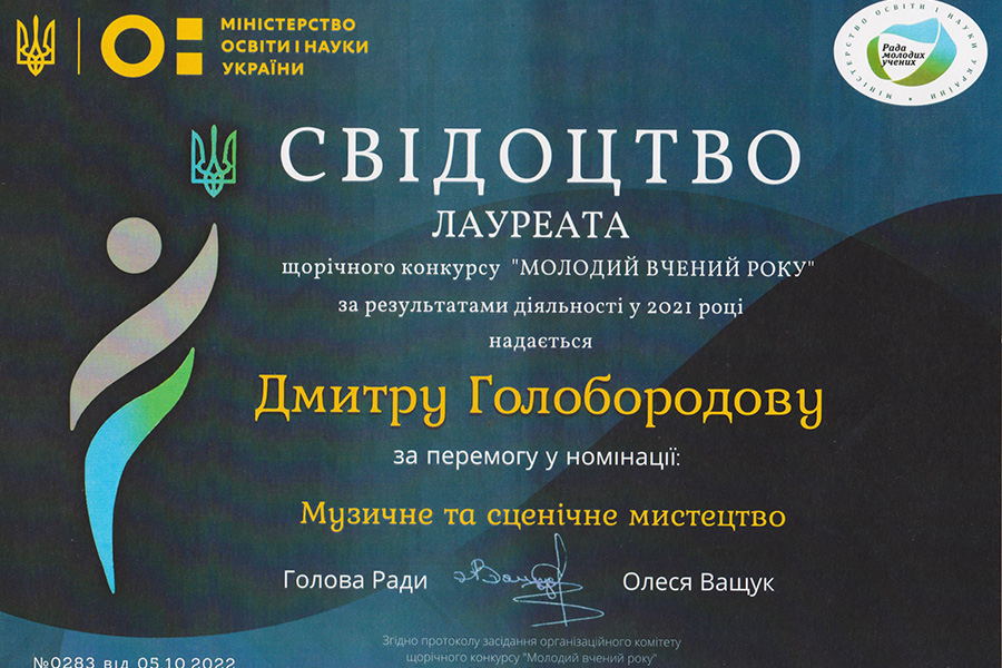Congratulations on the victory in the nomination "Music and Performing Arts" at the annual contest "Young Scientist of the Year" based on the results of the activities in 2021 of Dmytro Holoborodov, a student majoring in "Musical Art" (scientific adviser - Oleksandr Plohotniuk, Candidate of Pedagogical Sciences, Associate Professor of the Department of Musical Art and Choreography). The awarding ceremony took place on October 15, 2022 in the Kyiv House of Scientists of the National Academy of Sciences of Ukraine.
