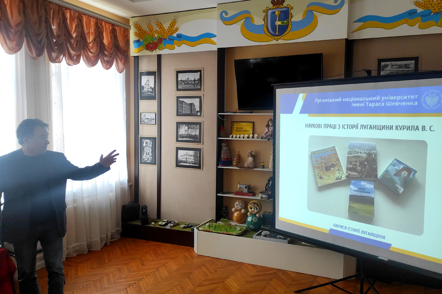 The presentation was opened by the author Vitalii KURYLO, who briefly spoke about his scientific activity, the process of creating the book, about his scientific works on the history of Luhansk region and Donbas, emphasized interesting aspects of the topics and content of the authors' joint work in the process of writing a scientific-historical publication. He thanked for the cooperation and assistance in the event to the director of the museum Nataliia Tsyganok and the researcher Tetiana Safronova.