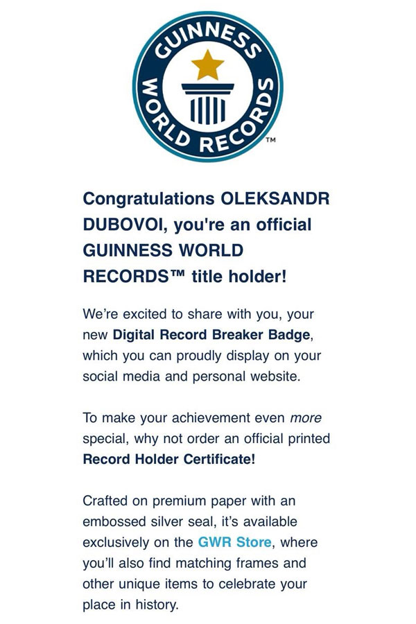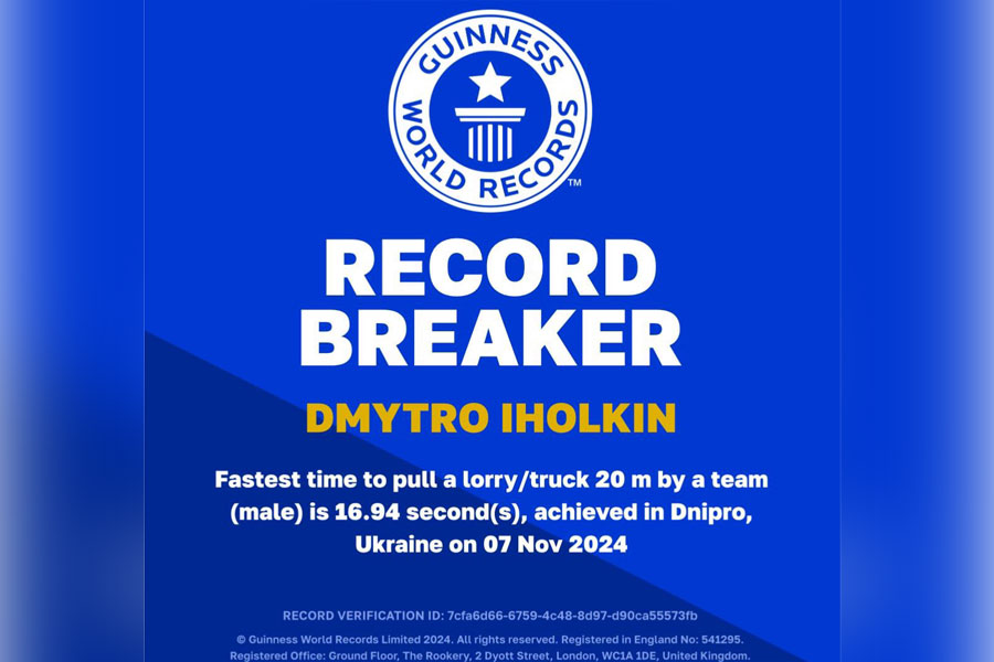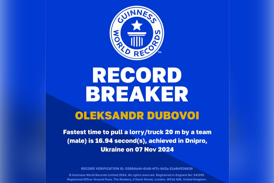 Official confirmation of breaking the record from the Guinness Book of World Records in the Truck pull exercise has arrived, which the Ukrainian national team in the strength athletics consisting of: Oleksandr Dubovoi, Dmytro Hrunskyi, Dmytro Iholkin, Volodymyr Savostianov successfully performed on November 7, 2024. The record of the record attempt and accompanying documents were submitted to the Guinness Book of World Records commission on the same day to establish the authenticity of this achievement.