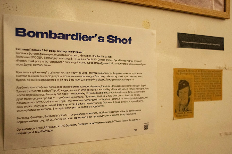 The exhibition is located in the Kultura art space in Poltava and presents little-known photographic evidence from American archives - aerial photographs of Poltava in 1944, taken during Operation Frantic.