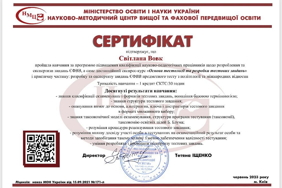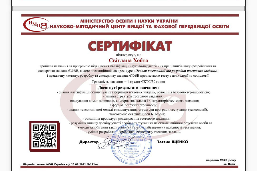 Thus, S. Vovk (Head of the Department of Political Science and Law) and S. Khobta (Associate Professor of the Department of Philosophy and Sociology) received another certificate of advanced training under the program of development and examination of tasks of the single professional entrance test. The trainings and the process of development and examination lasted almost 3 months, but this experience became an important step for teachers on the path of continuous improvement.