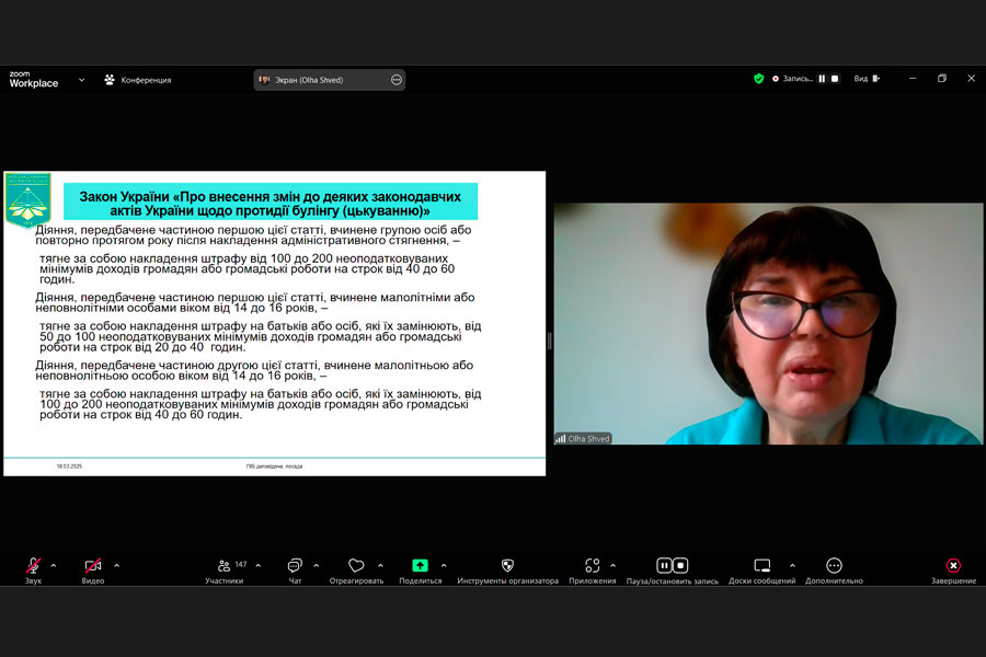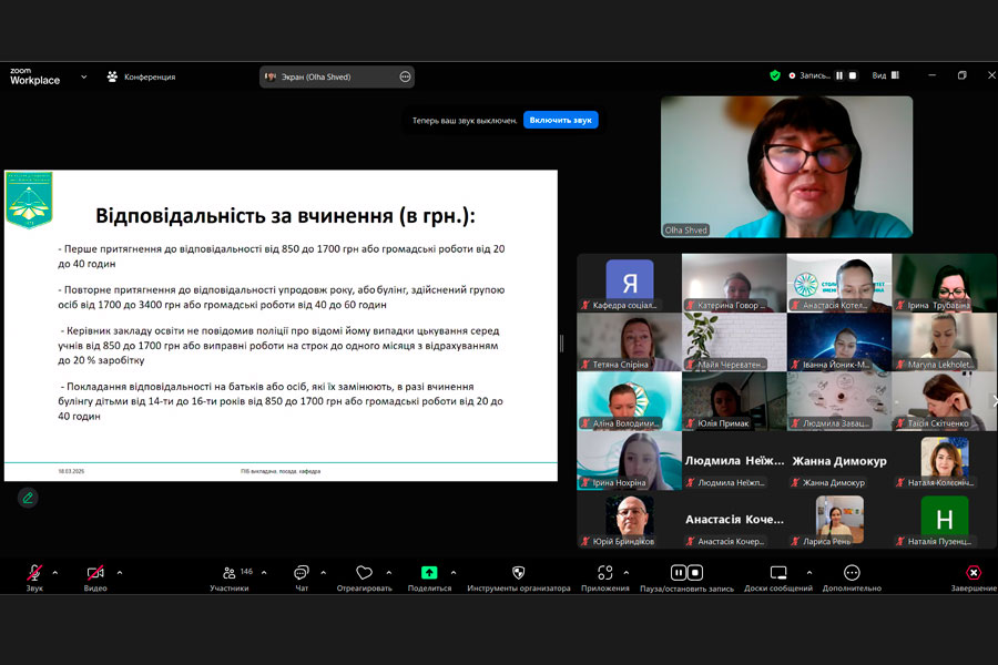 The speaker of the sixth edition was Olha Volodymyrivna Shved, Candidate of Sociological Sciences, Associate Professor, Associate Professor of the Department of Social Pedagogy and Social Work of the Borys Grinchenko Kyiv Metropolitan University. She spoke on an extremely relevant topic: “Bullying. Mobbing. Sexual Harassment. How to Fight It?”