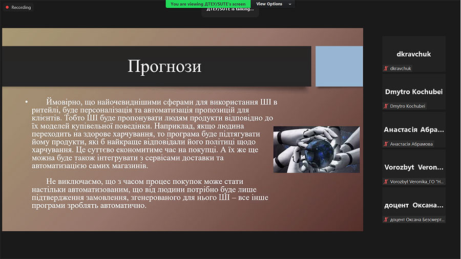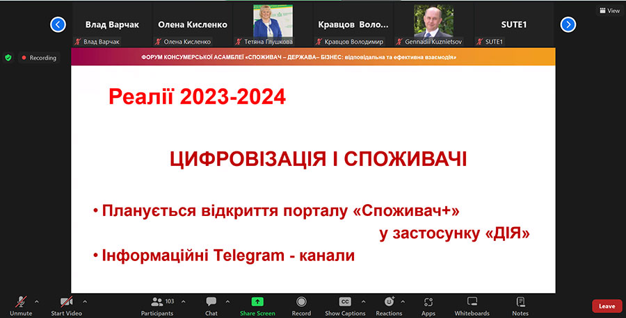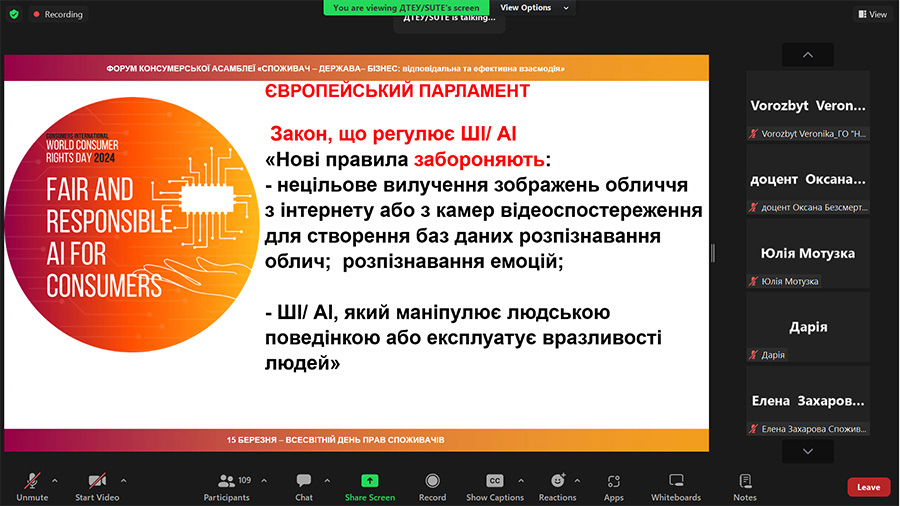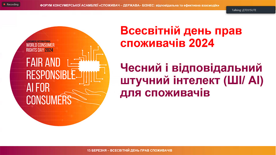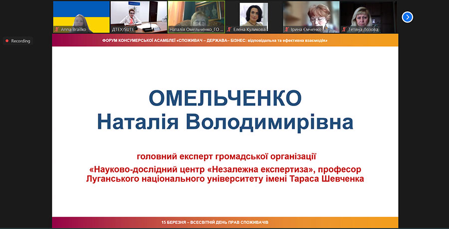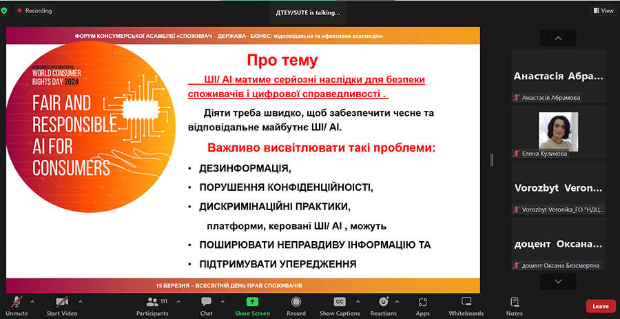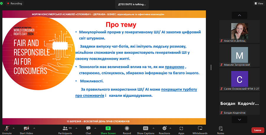 Every year on March 15, the consumer movement and other influential actors come together to celebrate World Consumer Rights Day to raise global awareness, protection and empowerment of consumer rights. That is why, on March 15, 2024, on the occasion of World Consumer Rights Day 2024, bachelor's students and master's students of the educational program "Commodity Science and Expertise in Customs Affairs" and scientific and pedagogical staff of the Department of Commodity Research and Entrepreneurship of the Educational and Research Institute of Technologies and Trade (ER ITT) of the Luhansk Taras Shevchenko National University joined the participation online in the forum of the Consumer Assembly of Ukraine "Consumers - Business - State: Effective Interaction": panel session 1. Realities of development consumer market under martial law conditions; panel session 2. Digitalization. Consumer and artificial intelligence (forum program).