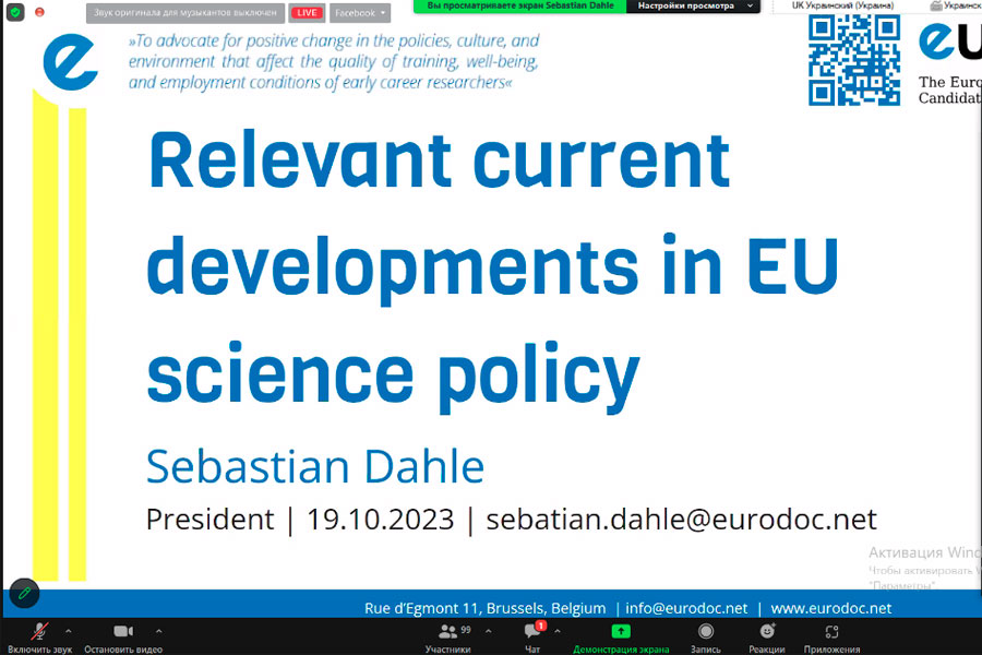 As part of the international panel, the issue of cooperation and support for scientific and scientific-technical activities of young scientists in Ukraine was revealed. (Representatives of which were: Eurodoc (Sebastian Dahle), Polish Academy of Sciences Representative Office in Kyiv (Mateusz Bialas), Elsevier (Rachel Herbert), Warsaw School of Economics (Iryna Degtyaryova), Scholar Support Office (Yevheniia Polishchuk), Technical University of Munich (Liudmyla Lisova)).
