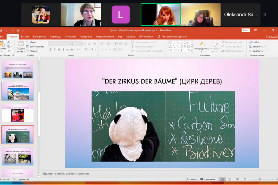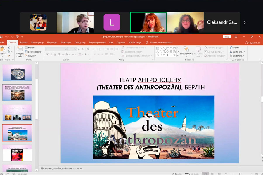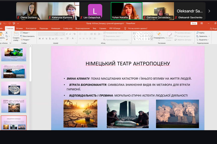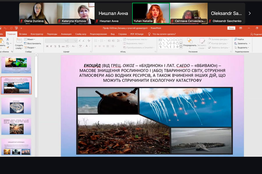 Prof. Nataliia Yuhan delivered a presentation at the plenary session of the online seminar on the topic: “Ecocide as an Existential Crisis of Humanity in Contemporary German-Language and Ukrainian Drama”. The PhD students of the Department of Literary Studies, Eastern Philology, and Translation – M. Tkachenko, D. Volynskyi, and S. Hladilin – participated in the sectional meetings. All presentations and scientific articles by our researchers were highly praised by the participants of the seminar.
