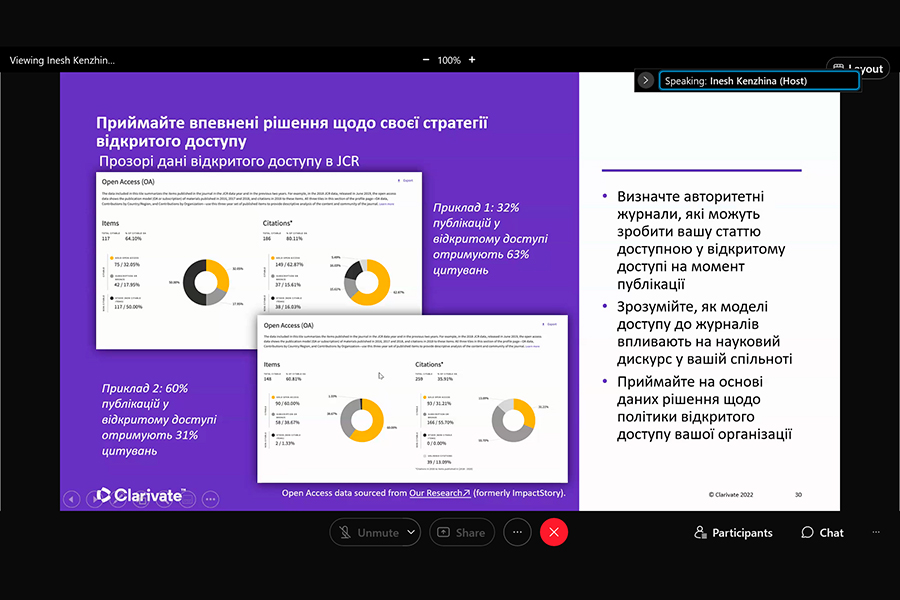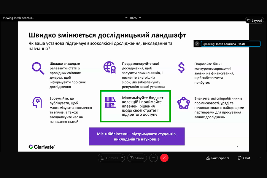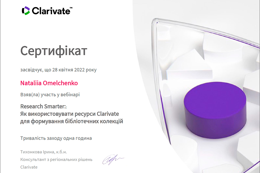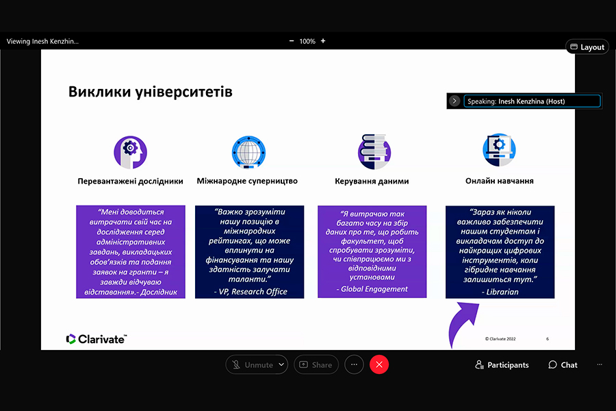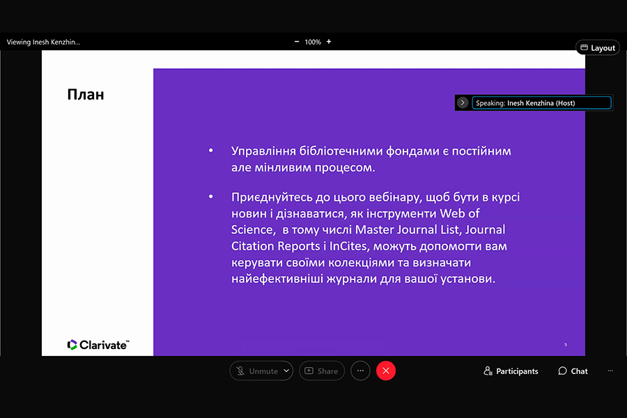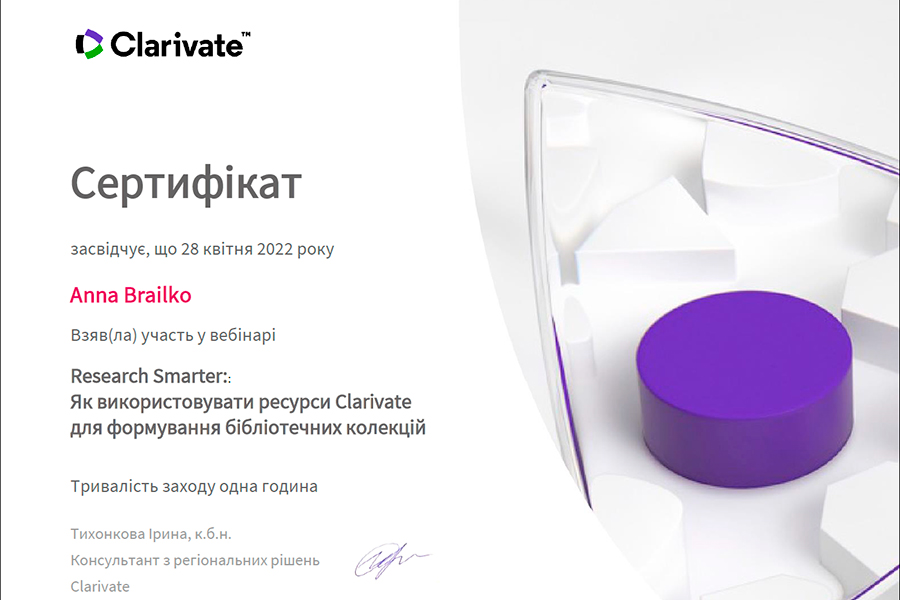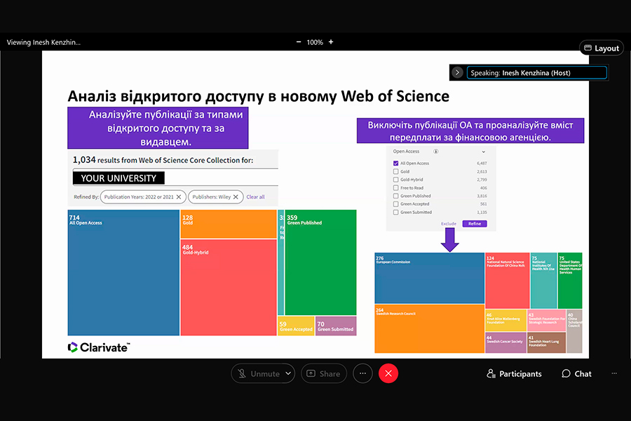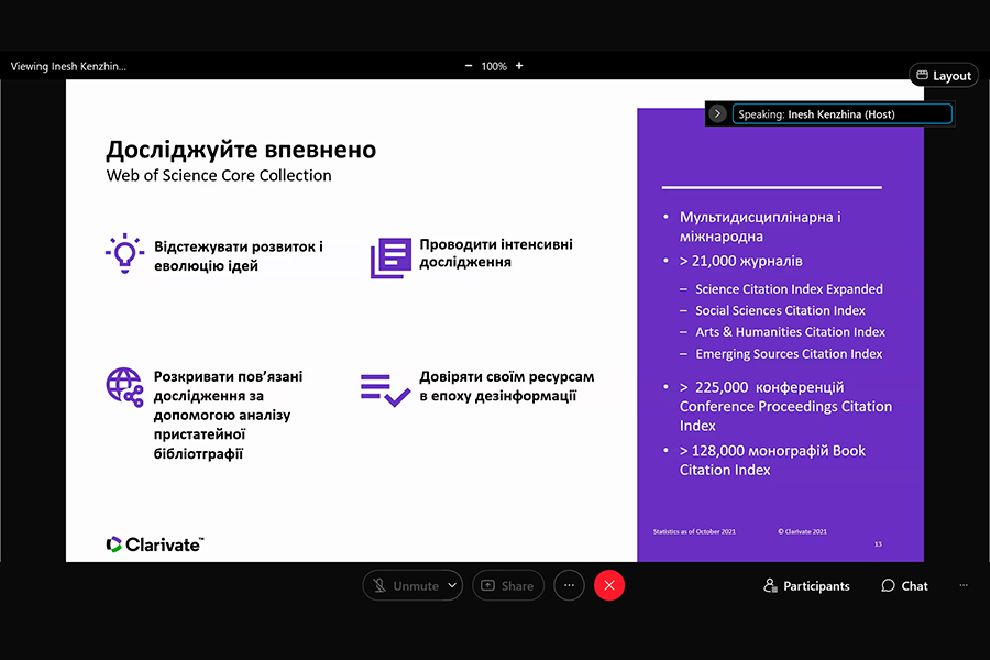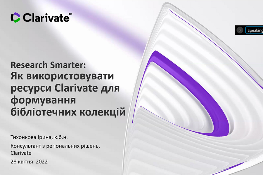 The event was conducted by Iryna Tykhonkova, Clarivate Analytics Regional Solutions Consultant (Head Office: London, UK). During the webinar we found out: the problems faced by researchers and teachers of Ukrainian and foreign universities; the need to create your own collections using all possible tools, including Clarivate resources.