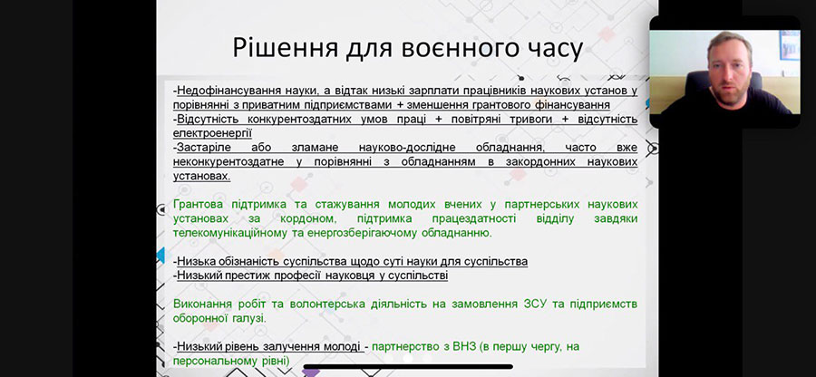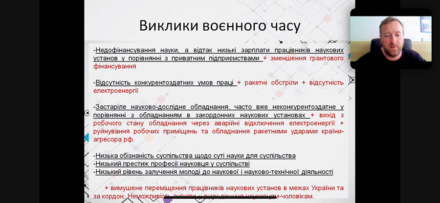 Special attention was paid to forecasting the state of science in the post-war period and considering decisions regarding the preservation and development of the scientific unit in the post-war period, namely: simplification of the conditions for conducting scientific and scientific-technical activities, increasing the funding of science in accordance with the Law of Ukraine "On Scientific and Scientific-Technical Activity" (its implementation), the opening of opportunities for the participation of Ukrainian scientists and scientific institutions in European programs on equal rights with scientists and scientific institutions of EU countries, the opening of structural funds, the state policy of accepting the development of science-intensive enterprises (including the defense industry) and their cooperation with scientific institutions, state policy in the field of popularization of science and education.
