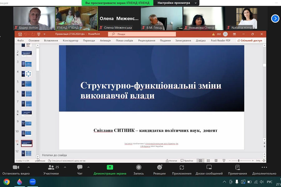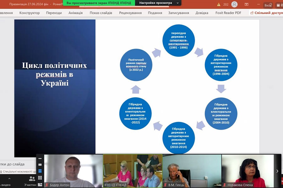 The subject of discussion was the changes that took place in the political field of Ukraine under the influence of the war unleashed by Russia. Attention was focused on the key aspects of political changes in Ukraine caused by the conditions of martial law - on functional changes in the country's political system, on new formats of relations between the government and society, on innovations in the implementation of the Euro-Atlantic course of the Ukrainian state. The sphere of analysis of political changes in the country became the functioning of political and power institutions, the nature of political governance in accordance with the activation of social processes in the spiritual, cultural, ethno-political spheres, the search for ways to integrate Ukraine into the global democratic space.