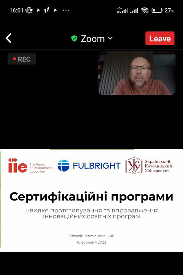 Oleksii Molchanovskyi, head of the Innovation Office of the Ukrainian Catholic University, shared his experience in the development and implementation of certification programs. Certification programs are an effective mechanism for the HEIs, their duration can range from several days to months. Such programs allow trying out new topics, test and attract new audiences, test the work of new teachers and teaching approaches, and can also bring additional income to the university.