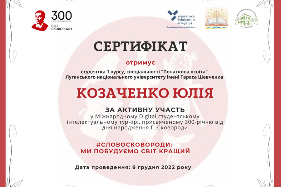 The tournament was held on December 8, 2022 at the Kharkiv Korolenko State Scientific Library. The specially invited guest was Bohdan Beniuk, who warmly greeted the participants. Tasks were performed on the Kahoot platform. The meeting began very interestingly and excitingly. This mood accompanied the participants throughout the tournament. First, the students showed their knowledge of the aphorisms of the famous philosopher. After that, they made a cloud of words from his sayings, in which students characterized the artist from different aspects not only of his creative nature, but also mentioned his pedagogical activity, as well as, for example, the fact that Skovoroda was a vegetarian.
