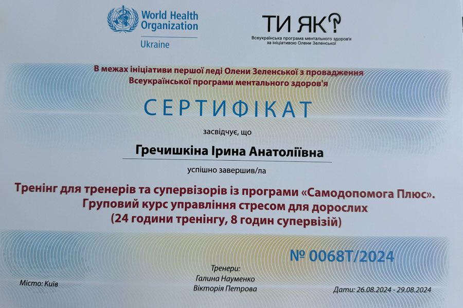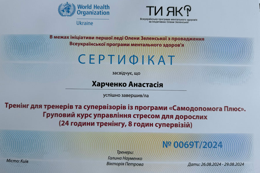 From 26.08 to 29.08, teachers of the Educational and Research Institute of Pedagogy and Psychology, Associate Professor Iryna Grechishkina (Department of Early and Preschool Child Development) and Assistant Anastasia Kharchenko (Psychology Department) successfully completed the training "Training for trainers and supervisors from the program "Self-help Plus".