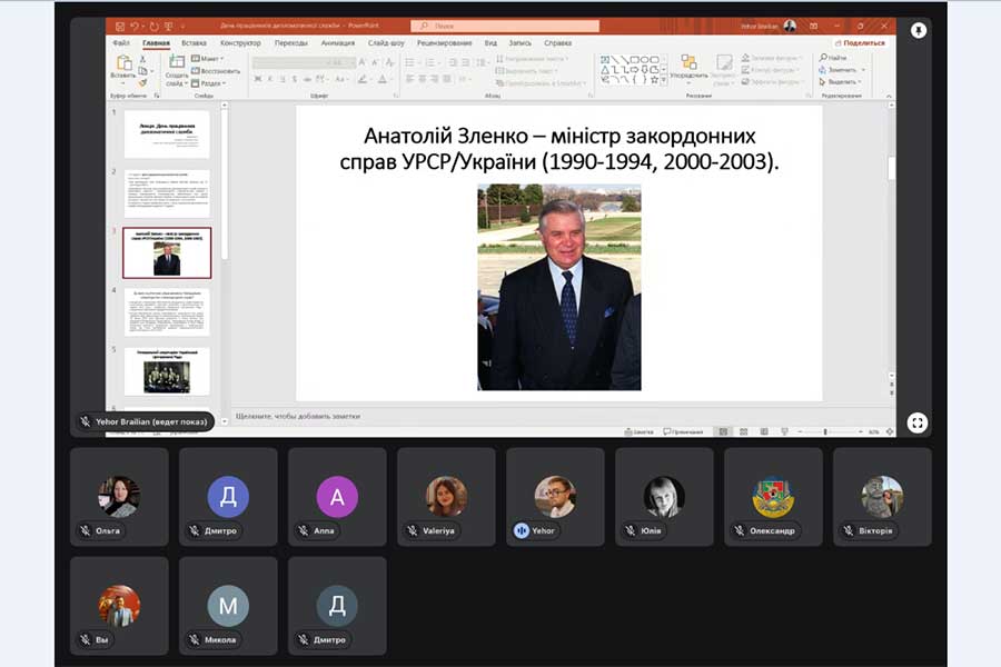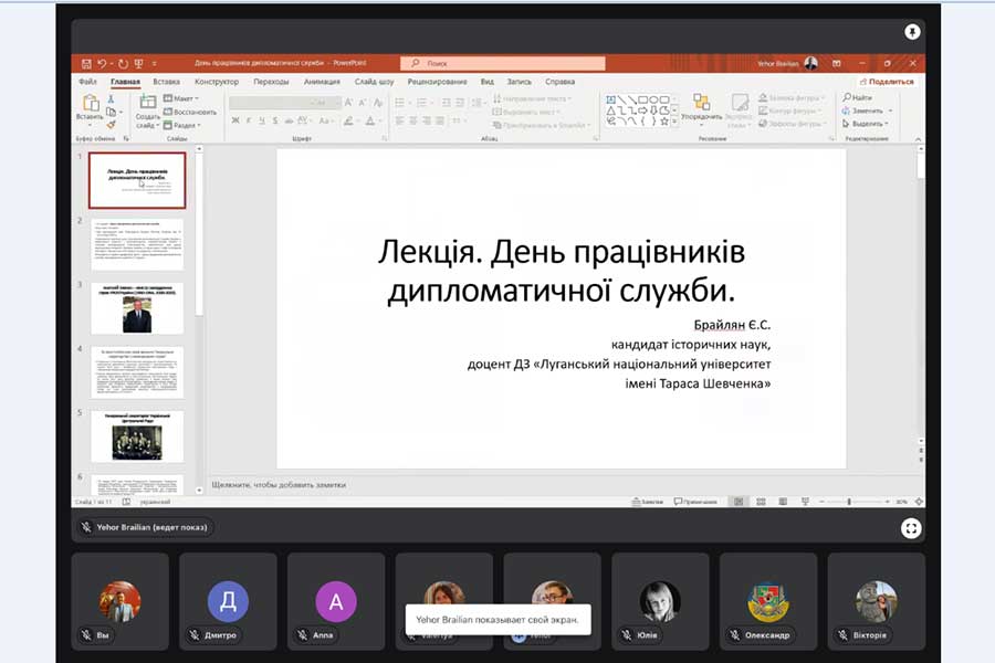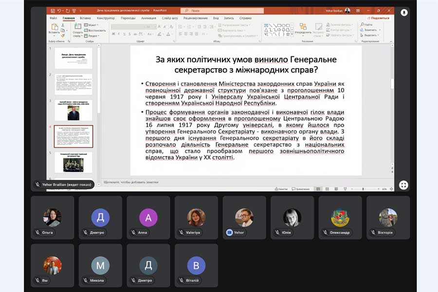 On December 22, Candidate of Historical Sciences, Associate Professor of the Department of History and Archaeology of Luhansk Taras Shevchenko National University Yehor Brailian gave an open lecture dedicated to the Day of Diplomatic Service Workers. The scientist spoke about how the foreign policy of the Ukrainian People's Republic was formed in 1917-1918. It was on December 22 that the General Secretariat for International Affairs under the government of the UNR was created. The first head of the institution was the famous public figure, politician, member of the Ukrainian Party of Socialist Federalists Oleksandr Shulhyn (1889-1960).