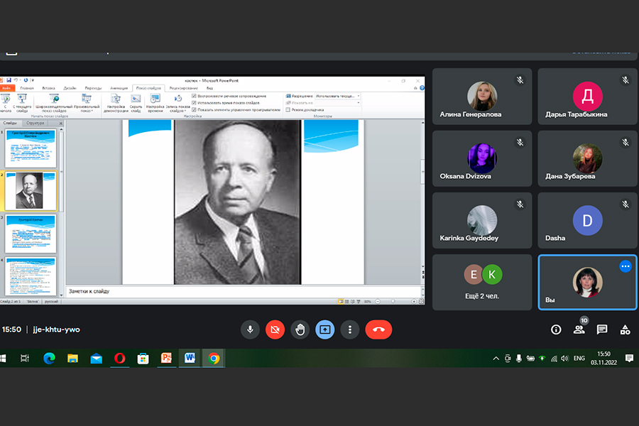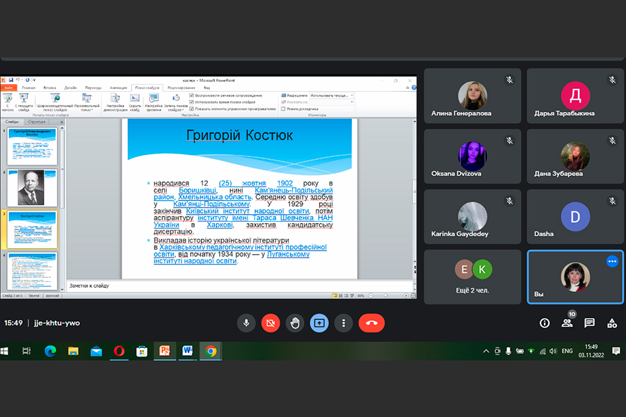 Students majoring in "Elementary Education. Ukrainian Language and Literature" of the Educational and Research Institute of Pedagogy and Psychology joined the celebrations on the occasion of the jubilee anniversary of the outstanding scientist and public figure. On the third of November, on the Google meet platform, the teachers of the Department of Philological Disciplines held a seminar "Hryhorii Kostiuk and his time", which was attended by students of the final courses. It outlined the contribution of H. Kostyuk to the study of the aesthetic and cultural phenomenon of the era, the revival of Ukraine, presented the most famous achievements of the scientist in the field of literary studies, characterized the importance of educational activities in the East of Ukraine.