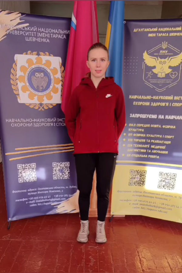 Kateryna KRYVETS — a 3rd year student majoring in Secondary Education (Physical Culture), active participant in scientific projects, senior of the group, athlete (coach — Serhii Kryvosheya, scientific supervisor — Prof. Olena Otravenko);