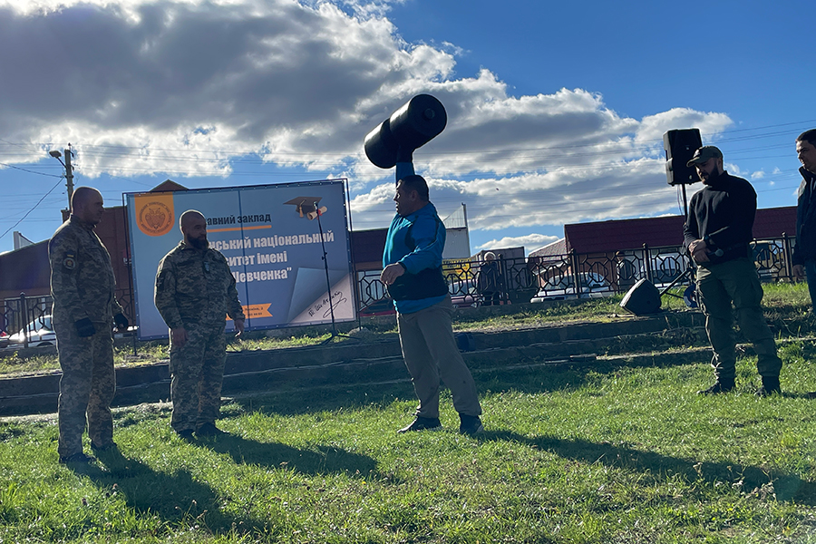 After the concert, the master of sports of Ukraine of international class, the Director of the Institute of Physical Education and Sports, Oleksandr Dubovyi, took over the baton and addressed the audience with a patriotic speech. He invited real Ukrainian Cossacks to the shell "Bogatyr dumbbell" weighing 50 kg, whose weight was increased to 60 and 70 kg, respectively, during the competition.