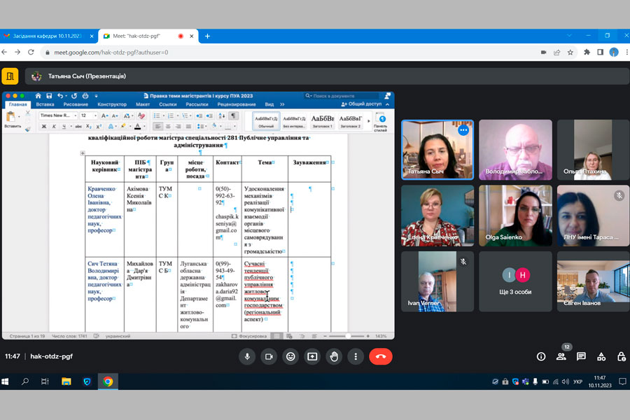Among the most important issues, the organization and conduct of the final certification of master's students majoring in 281 "Public Management and Administration" were considered. The director of the Educational and Research Institute of Public Management, Administration and Postgraduate Education, Professor Volodymyr Zablotskyi outlined the conditions and problematic issues regarding the conduct of the Unified State Qualification Examination (UEKI), which were also discussed with students at the consultative conference on November 9, 2023.