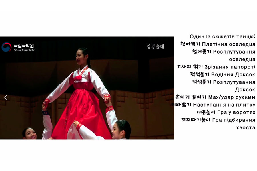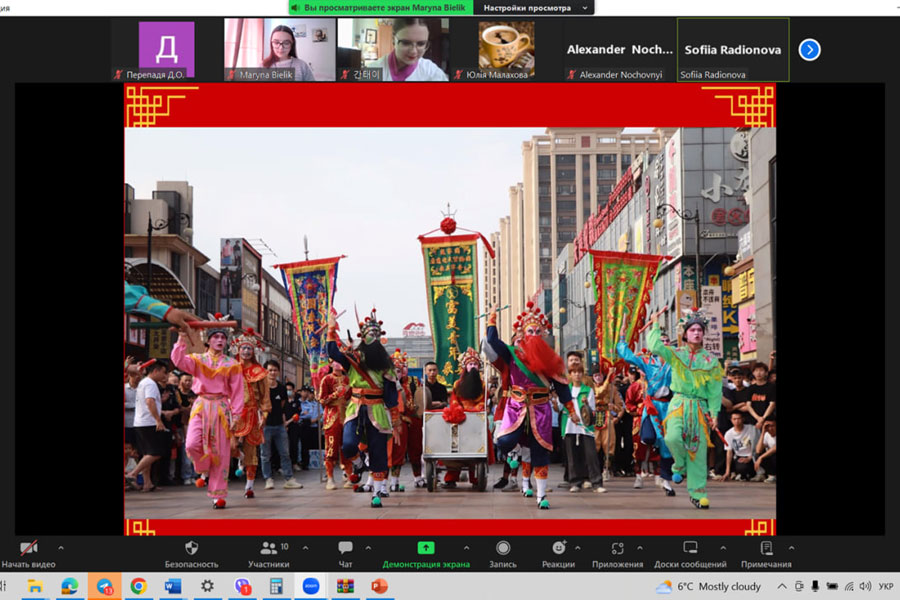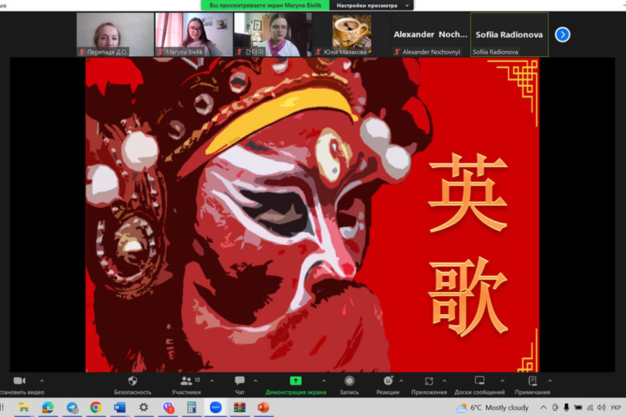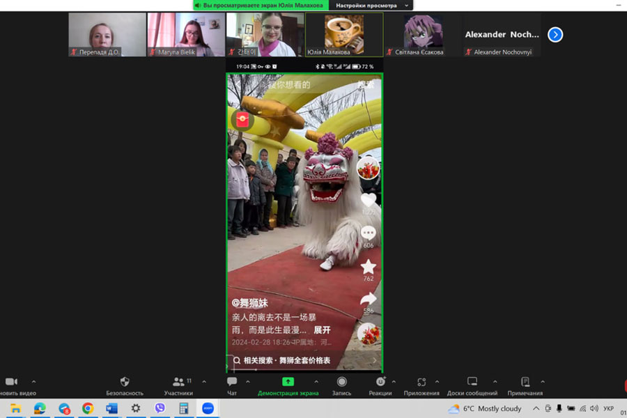 Students and teachers prepared reports and vivid presentations. Sofia Nedohybchenko, 1st year student, presented a report on "Korean Traditional Dances" and conducted a master class on the 강강술래 dance and a separate part - 손치기 발치기. Valeriia Zapoteieva, a 3rd year student, revealed the peculiarities of the Chinese folk dance "英歌" and introduced the traditions associated with the festival where this dance is traditionally performed. She also spoke about the origin of the performers' makeup, which has its roots in traditional Chinese costumes. Svitlana Esakova, a 4th year student, dedicated her presentation to the Lion Dance (舞狮). She invited the club members to watch a video of artists performing this dance.