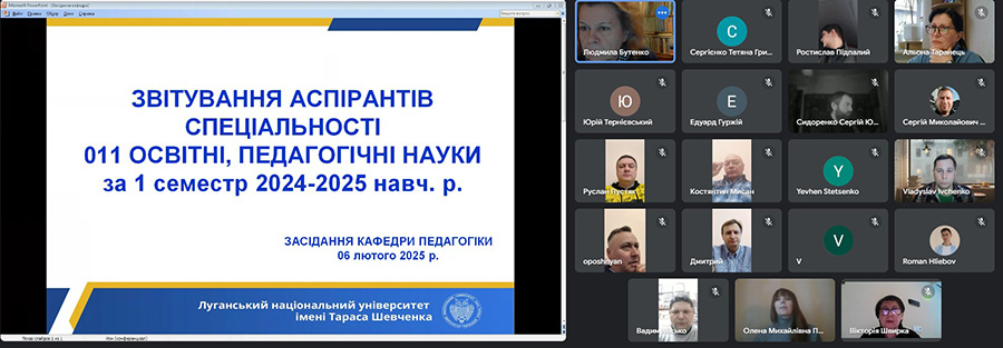 On February 6, 2025, during the meeting of the Pedagogy Department of Luhansk Taras Shevchenko National University, a report was made by 1st-4th year postgraduate students of the specialty 011 Educational, Pedagogical Sciences on the results of the implementation of individual plans of educational and scientific work for the first half of the 2024-2025 academic year.