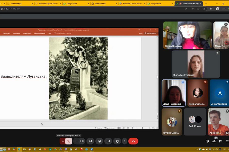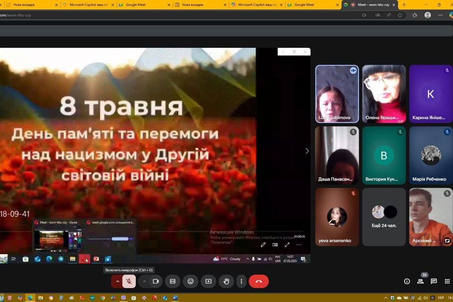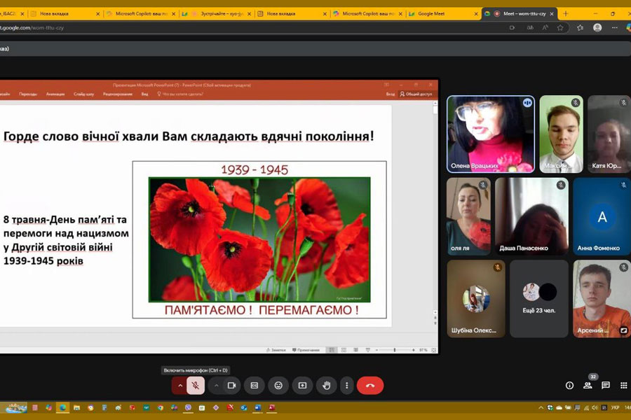 Студенти 1–4 курсів підготували історико-музичну композицію „Горде слово вічної хвали Вам складають вдячні покоління!”. Крізь кадри воєнних років лунали пісні та вірші в їхньому виконанні. У 80-ту річницю закінчення війни в Європі студенти розглядали цю війну з акцентом на ролі людей, які боролися проти нацизму. У прочитаних ними творах про своїх родичів відчувалася велика подяка і шана молоді за внесок дідів і прадідів у перемогу. Учасники зустрічі підкреслили важливу роль України як головного театру воєнних дій радянсько-німецького фронту та українців на різних фронтах другої світової війни, у тилу для забезпечення фронту всім необхідним. Присутні засудили російську версію нацизму – рашизм, який привласнив собі роль головного переможця і перетворив перемогу над нацизмом на пропаганду війни та практичне втілення її на території України.