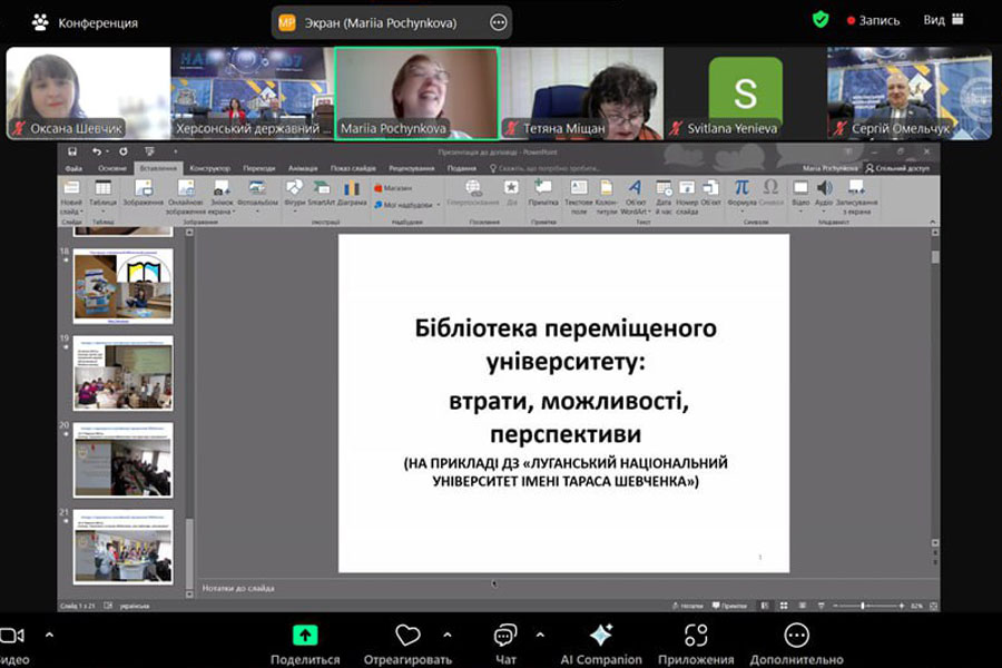 Мав честь бути запрошеним до виступу й наш університет, зокрема директорка бібліотеки виступила на панельній дискусії «Бібліотеки переміщених університетів у нових реаліях» з доповіддю «Бібліотека переміщеного університету: втрати, можливості, перспективи (на прикладі ДЗ «Луганський національний університет імені Тараса Шевченка)».
