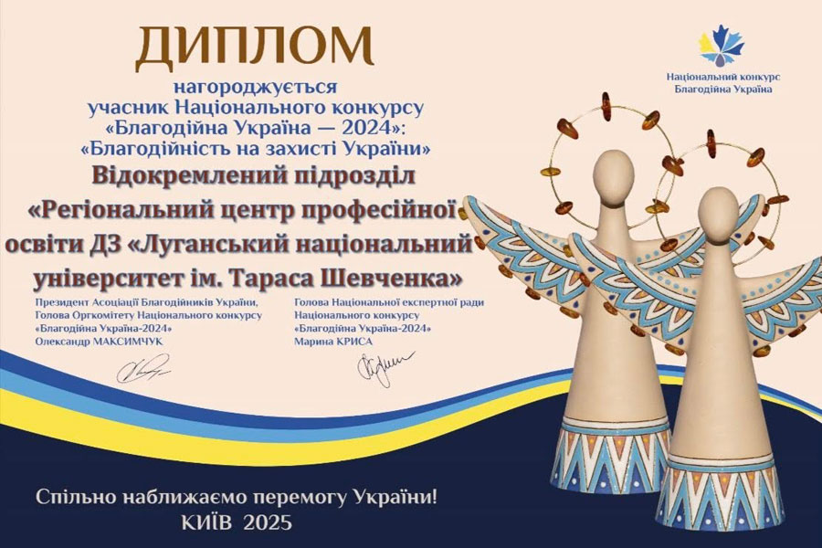 Відокремлений підрозділ «Регіональний центр професійної освіти ДЗ «Луганський національний університет імені Тараса Шевченка» отримав диплом Національного конкурсу «Благодійна Україна — 2024» у номінації «Благодійність на захисті України».