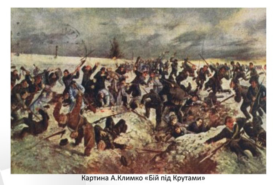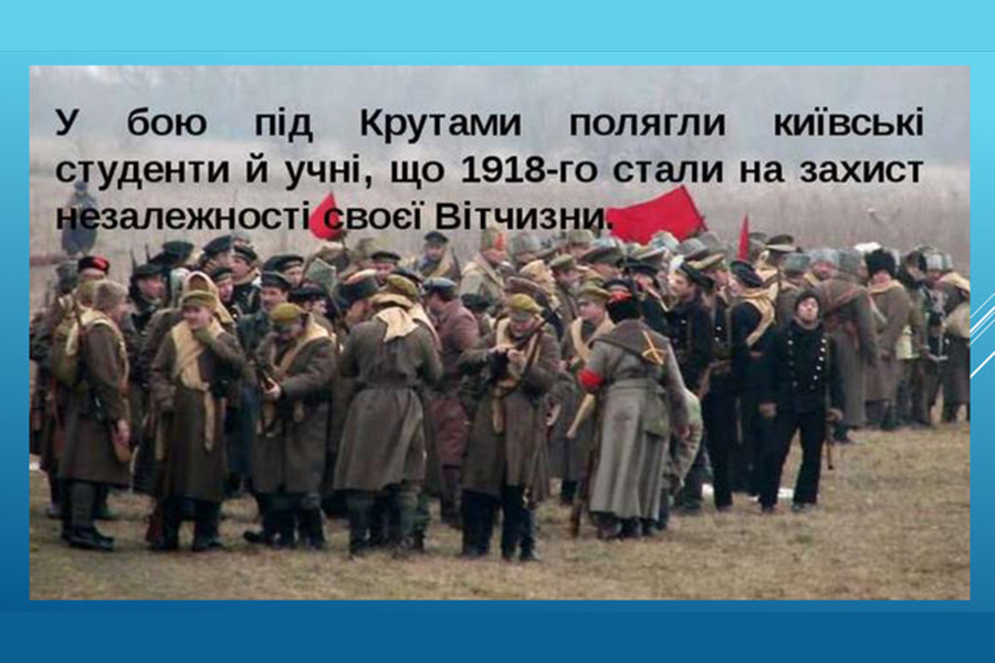 Бій українських вояків проти більшовицької армії на станції Крути затримав ворога на чотири дні. Таким чином добровольці утримали столицю на час, необхідний для укладання Брест-Литовського миру, який означав міжнародне визнання української незалежності.