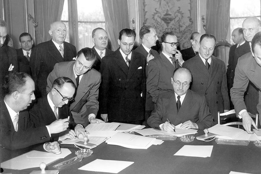 9 травня 1950 року в Парижі міністр закордонних справ Франції Робер Шуман закликав Францію, Німеччину та інші європейські країни об’єднати їхні вугільну та сталеливарну галузі промисловості (основи нарощування військової техніки) та віддати їх в управління нової наднаціональної структури. Це стало «наріжним каменем Європейської федерації». Завдяки об’єднанню економічних зусиль і розподілу досягнутих результатів європейські країни уникнули накопичення військової могутності одна проти одної, що й забезпечило мир у Європі.