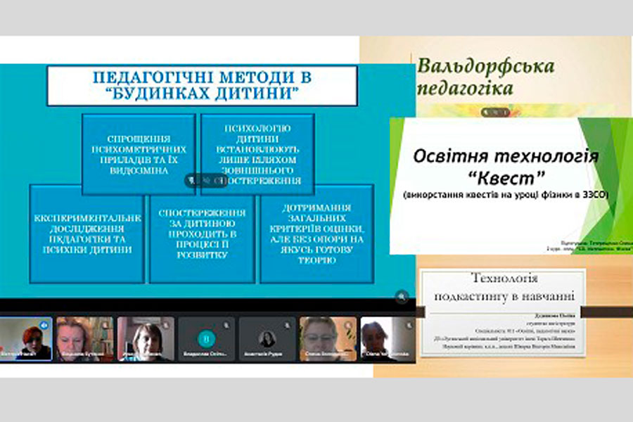 24 квітня для здобувачів вищої освіти спеціальності 014 «Середня освіта», магістрантів та аспірантів спеціальності 011 Освітні, педагогічні науки було проведено Марафон освітніх технологій. Представлено такі технології: «Сучасні педагогічні методи навчання в контексті педагогіки Марії Монтессорі» (Насвіт Вікторія, 2 курс, спец. «Спеціальна освіта. Логопедія»), «Вальдорфська педагогіка» (Єрисковська Олена, 2 курс, спец. «Спеціальна освіта. Логопедія»), «Освітня технологія «Квест» (використання квестів на уроці фізики в ЗЗСО)» (Тетерещенко Олена, 2 курс, спец. «Середня освіта. Математика, Фізика»), «Технологія подкастингу в навчанні» (Дудникова Поліна, магістрантка 1 курсу спец. 011 Освітні, педагогічні науки) та ін.