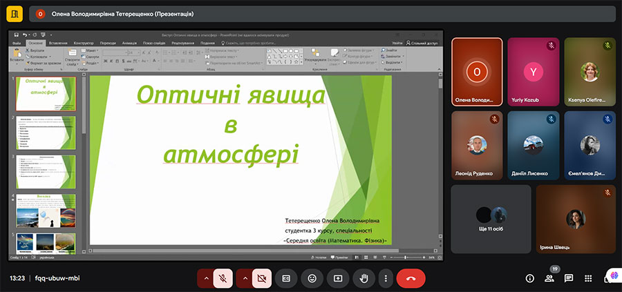Тетерещенко Олена, здобувачка освіти 3 курсу першого (бакалаврського) рівня вищої освіти, спеціальності СО (Математика), тема: «Оптичні явища в атмосфері», науковий керівник Швець І.М.;