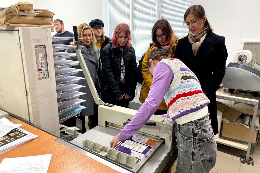 Екскурсія тривала дві години. Спочатку ми побували в офісі, де менеджери оформлюють закази, демонструють товари, обговорюють майбутній дизайн виробу. Далі було саме виробництво. Це двоповерхова будівля із безліччю типографських станків. Студентам спеціальності «Графічний дизайн» показали виробництво від маленьких наліпок до широкоформатного друку банерів, від виробництва службових посвідчень до лазерного друку на ялинкових прикрасах.
