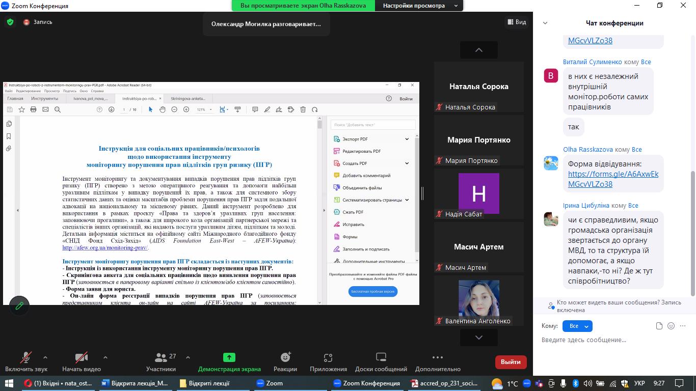Прикладним аспектом проведеної лекції є наданий доповідачами інструмент моніторингу випадків порушення прав дитини, зокрема скринінгова анкета для соціальних працівників.