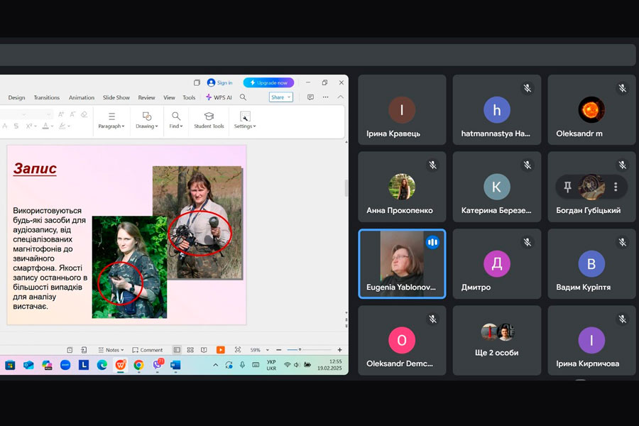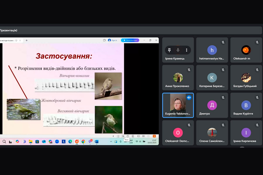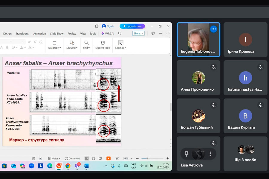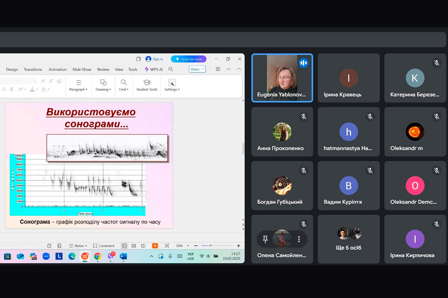 Лектором виступила Євгенія Яблоновська-Грищенко, старший науковий співробітник Канівського природного заповідника ННЦ «Інститут біології та медицини» Київського національного університету імені Тараса Шевченка. У зустрічі прийняли участь здобувачі та викладачі всіх спеціальностей ННІ ПАН. Під час презентації пані Євгенія представила ключові аспекти біоакустики — галузі зоології, що вивчає звукові сигнали тварин. Вона підкреслила, що біоакустика є важливим напрямком у світовій орнітології та має широке застосування в фауністиці, етології, зоогеографії, а також у таких дисциплінах, як інформатика, лінгвістика та філософія.