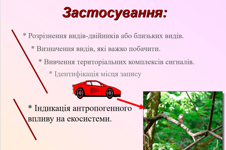 використання біоакустичних методів для охорони природи, зокрема створення охоронюваних територій на основі аналізу пісенних комплексів.