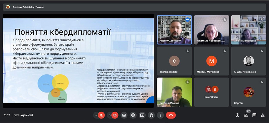 23 травня 2024 року для здобувачів спеціальностей Міжнародні відносини, суспільні комунікації та регіональні студії», «Політологія» та«Соціологія» навчально-наукового інститут соціальних і гуманітарних наук відбулася гостьова лекція радника з питань кібербезпеки МЗС України Андрія Валерійовича Заблоцького «Становлення кібердипломатії: стратегії та інструменти».